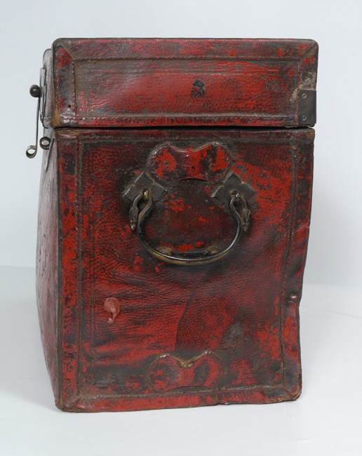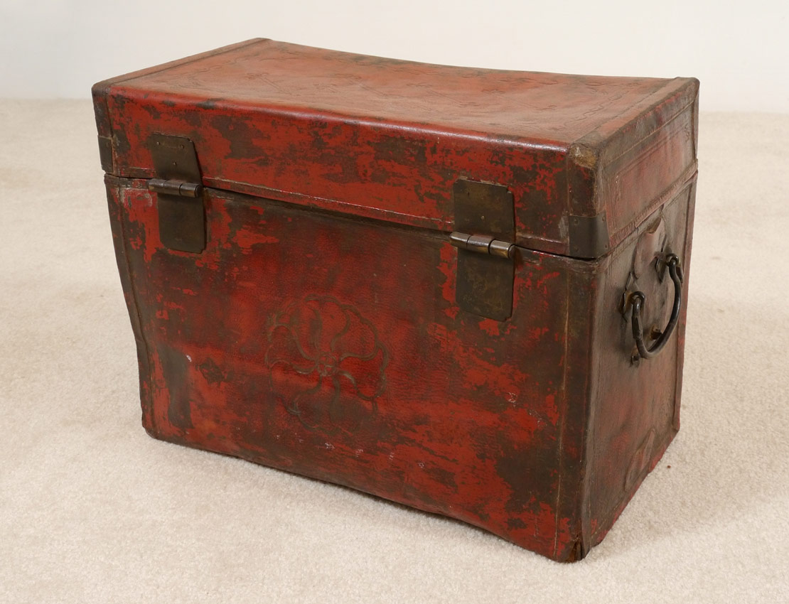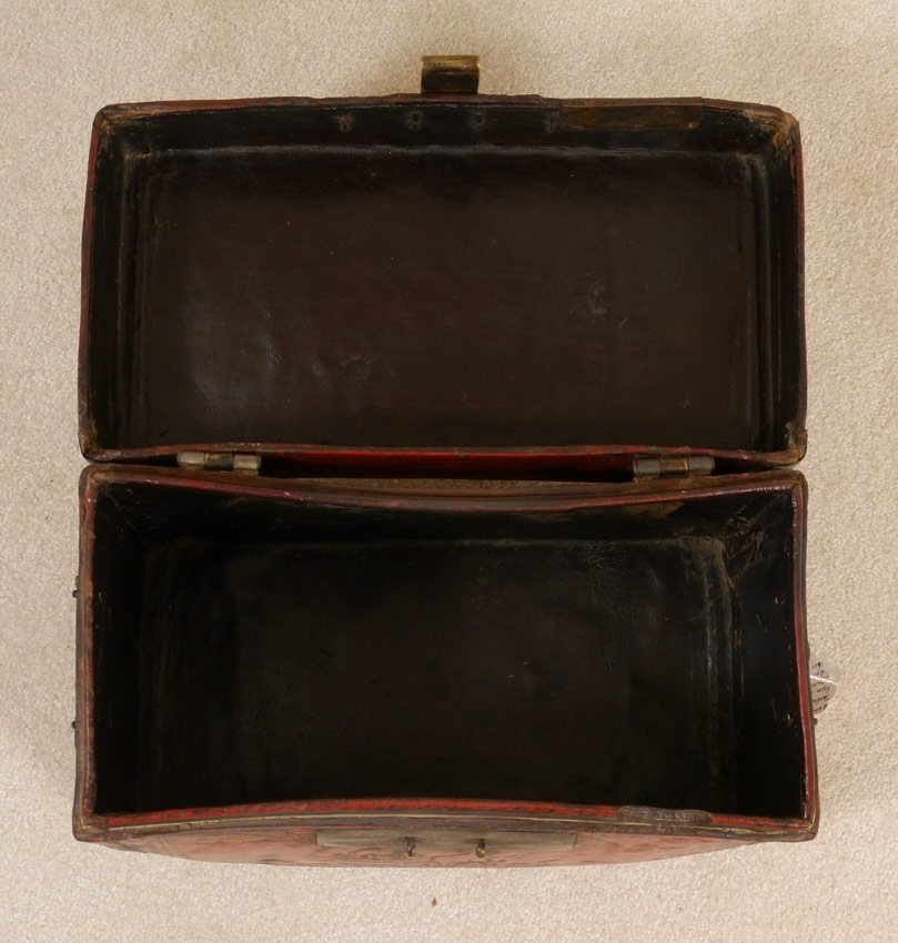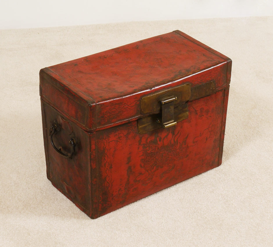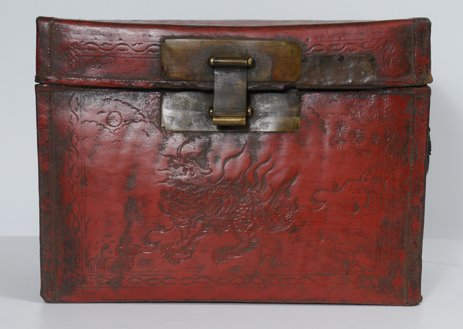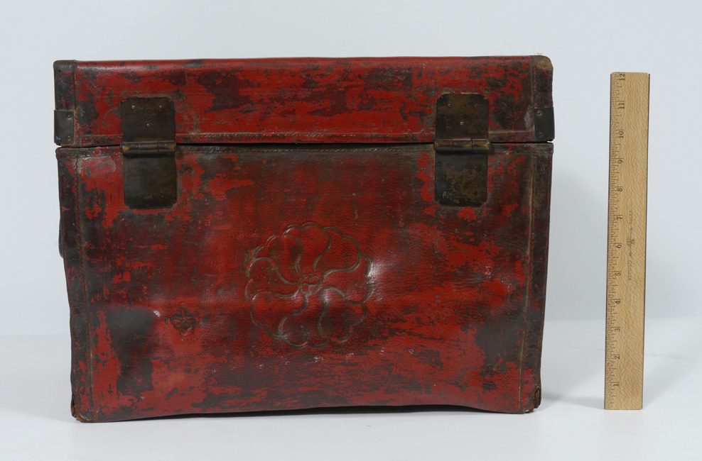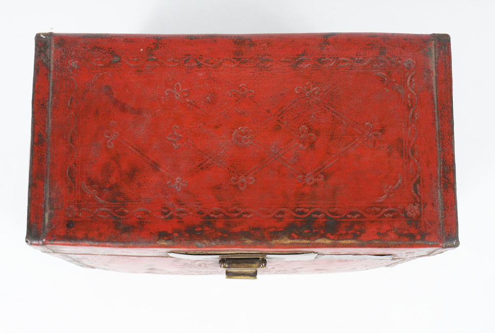 ANTIQUE CHINESE RED LACQUERED LEATHER DOCUMENT CASE: Stiff hand tooled leather case with early hardware. 12 1/2''h x 16 3/4''w x 8 3/4''d.