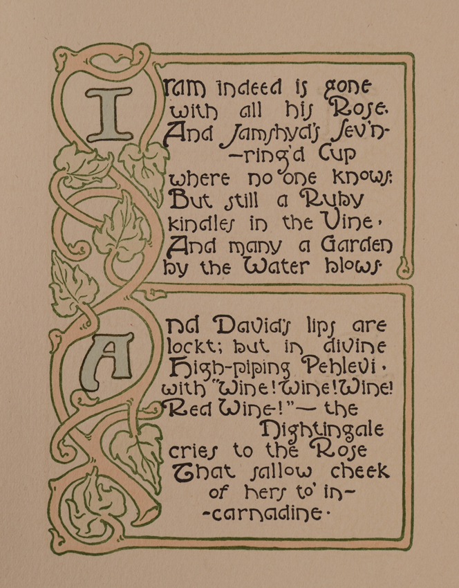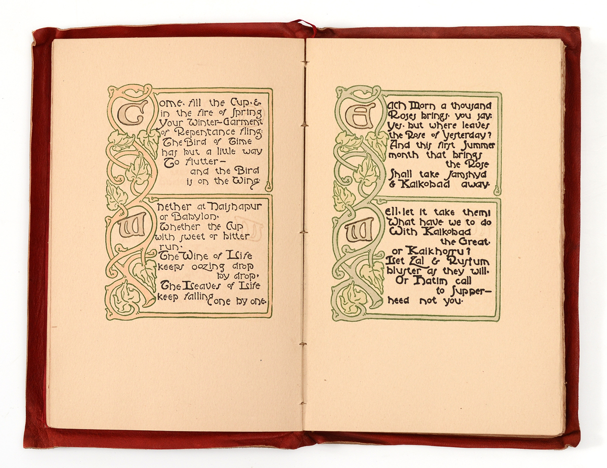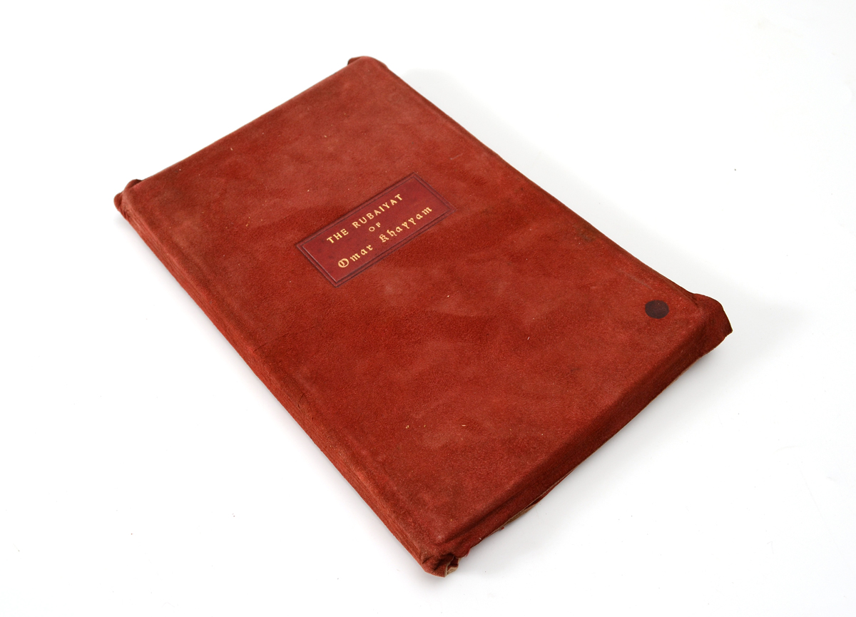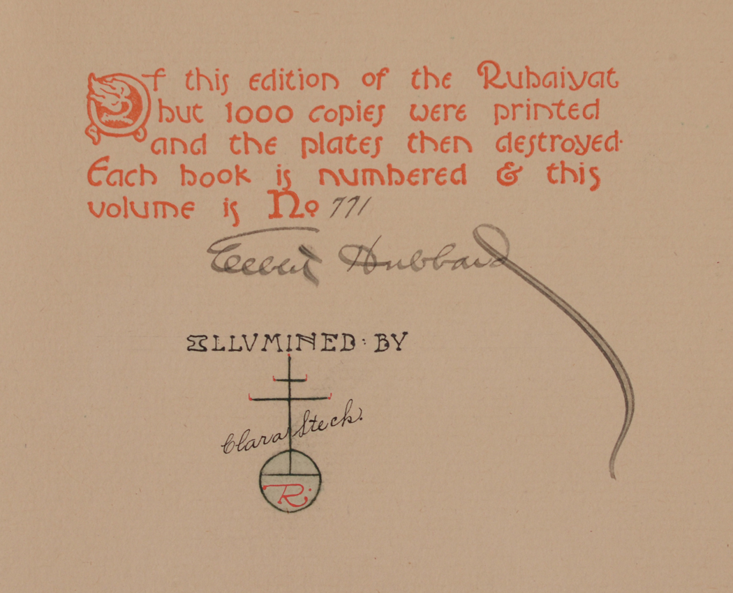 ROYCROFTERS ''RUBAIYAT OF OMAR KHAYYAM'' BOOK: Limited edition number 771 of 1000, copyright 1900. Signed in pencil by Elbert Hubbard, illuminated by Clara Stecks. Dedicated to Margarett E. Reed, 12-25-02. Red leather cover with gilt lettering. 8 1/4'' x 6''.