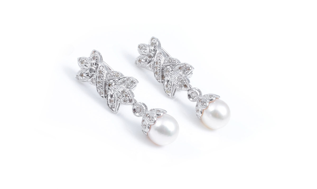 18K PEARL & DIAMOND EARRINGS: 18K white gold drop earrings featuring 2 creamy white high luster 8.5-9 mm pearls. The diamonds total approx .75 Ct. Post and hinge closure. Length: 1.5''. Weight: 11 grams.