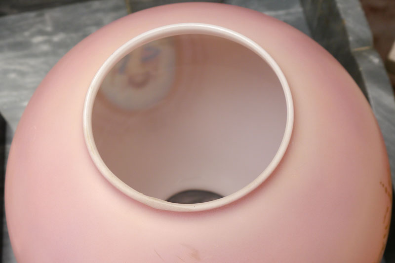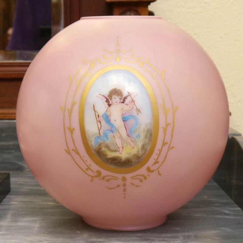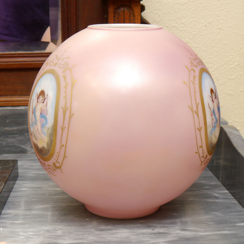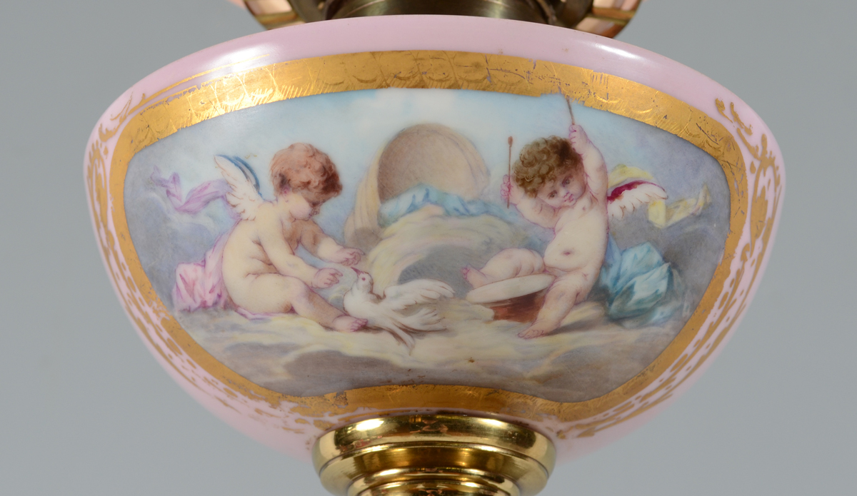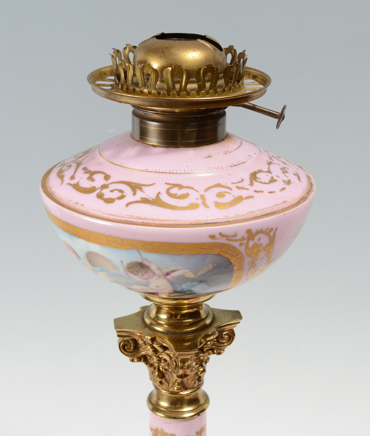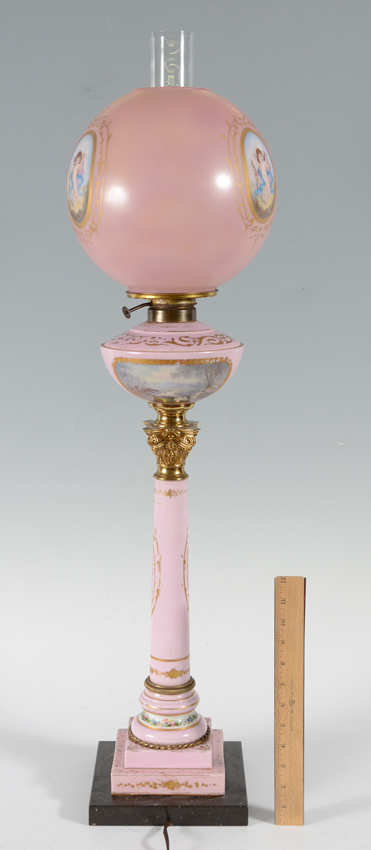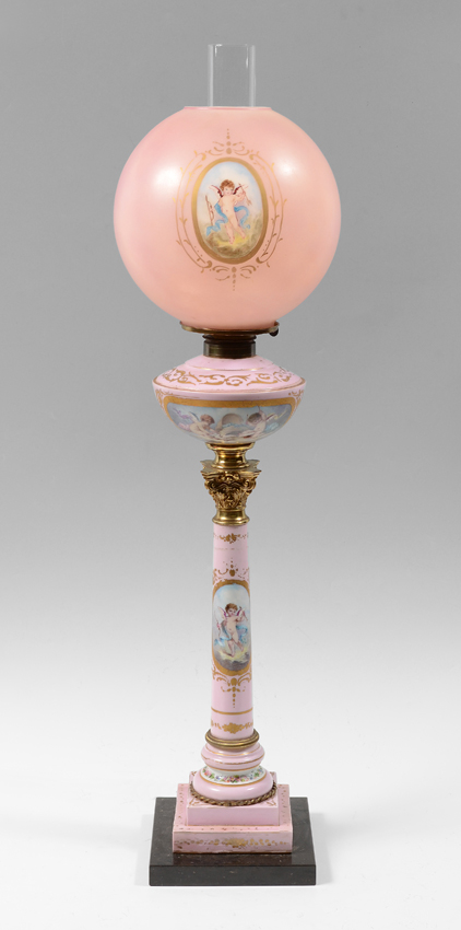 CHERUB DECORATED GONE WITH THE WIND BANQUET OIL LAMP: Hand painted porcelain and glass stem, font and globe. Brass mountings. Measures approx. 33'' tall, the globe 9 1/2'' dia. Mounted on a black marble base.
