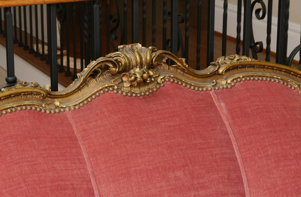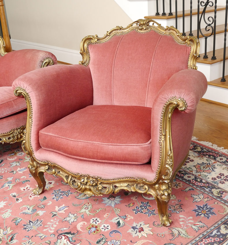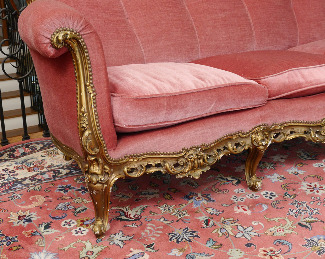 PINK MOHAIR PARLOR SET ON GILT FRAMES: Carved Rococo style gilt wood frames with mohair stuffed tacked mauve upholstery and cushions. To include sofa 36 1/2'' h. x 82'' x 38'', 2 armchairs 33'' h. x 36 3/4'' x 33 1/2''.