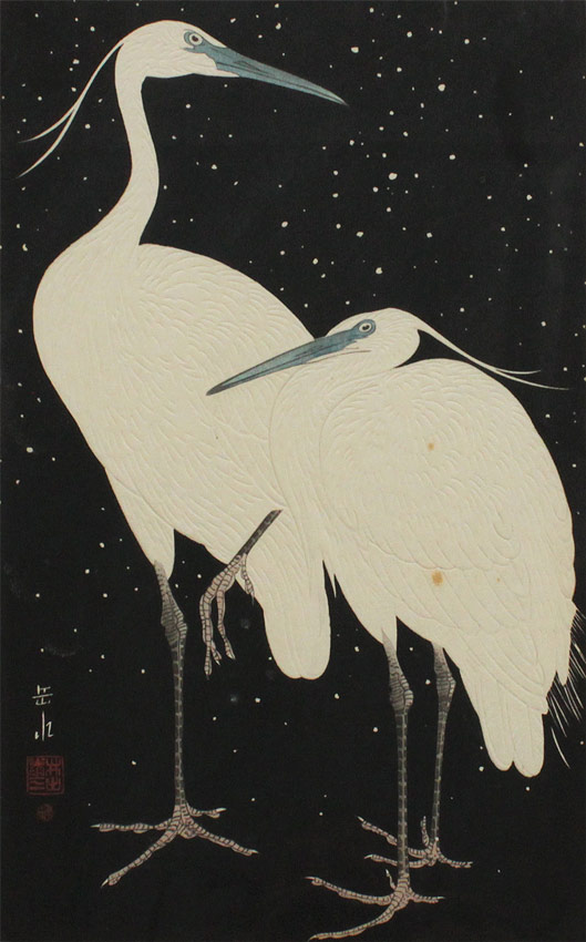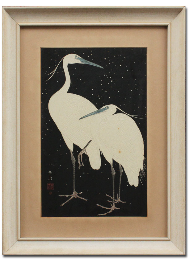 GAKUSUI, Ide, (Japanese, 1899-1982): ''White Herons'', Woodblock, Sight size 14'' x 9'', Chop mark lower left, painted white frame 20 1/2'' x 15 1/2''.