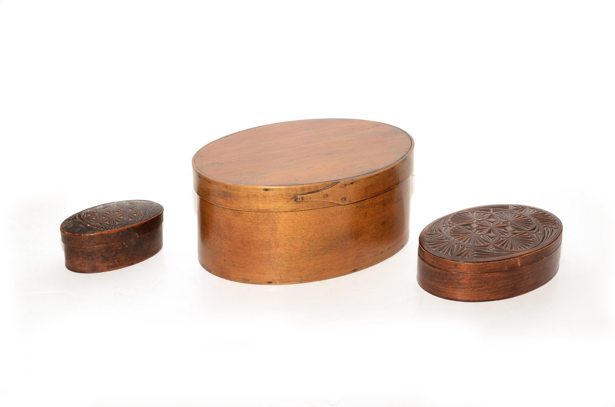 3 BOXES TO INCLUDE NEW LEBANON SHAKER: 3 pieces total to include 1) New Lebanon, NY covered oval Shaker box. Maple body with 3 fingers on body, one on lid. Measures 5'' h. x 11 1/2'' x 8 1/4''. 2) Oval covered box with stylized carved lid, 2 1/4'' h. x 7 3/4'' x 5 1/4''. 3) Smaller covered oval box with stylized carved lid, 2 3/8'' h. x 5 1/4'' x 3''.