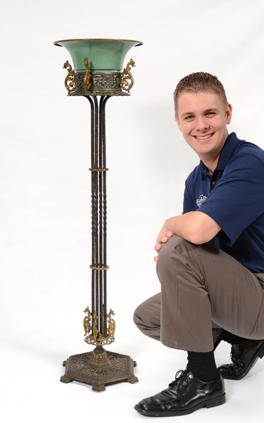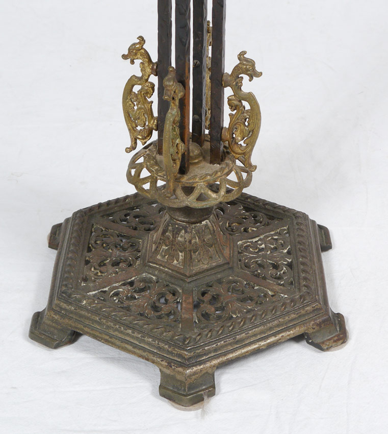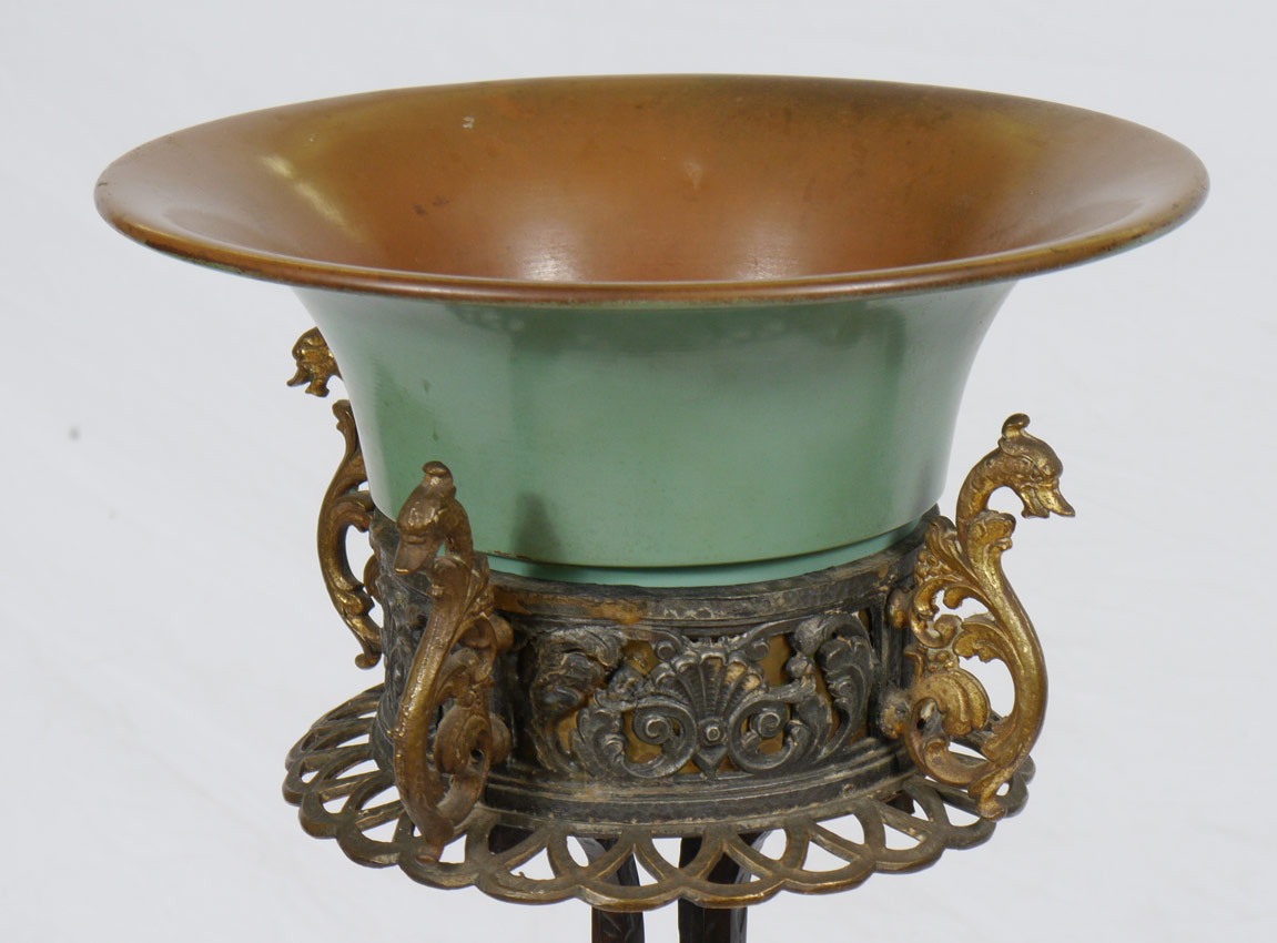 OSCAR BACH STYLE WROUGHT IRON FERNER: Stand with gilt decorated figural swans at top and base, foliate scroll and shell motifs at top. 4 column wrought iron body, 6 sided base. Copper insert with enamelled green exterior. 47'' h. x 13'' base dia.