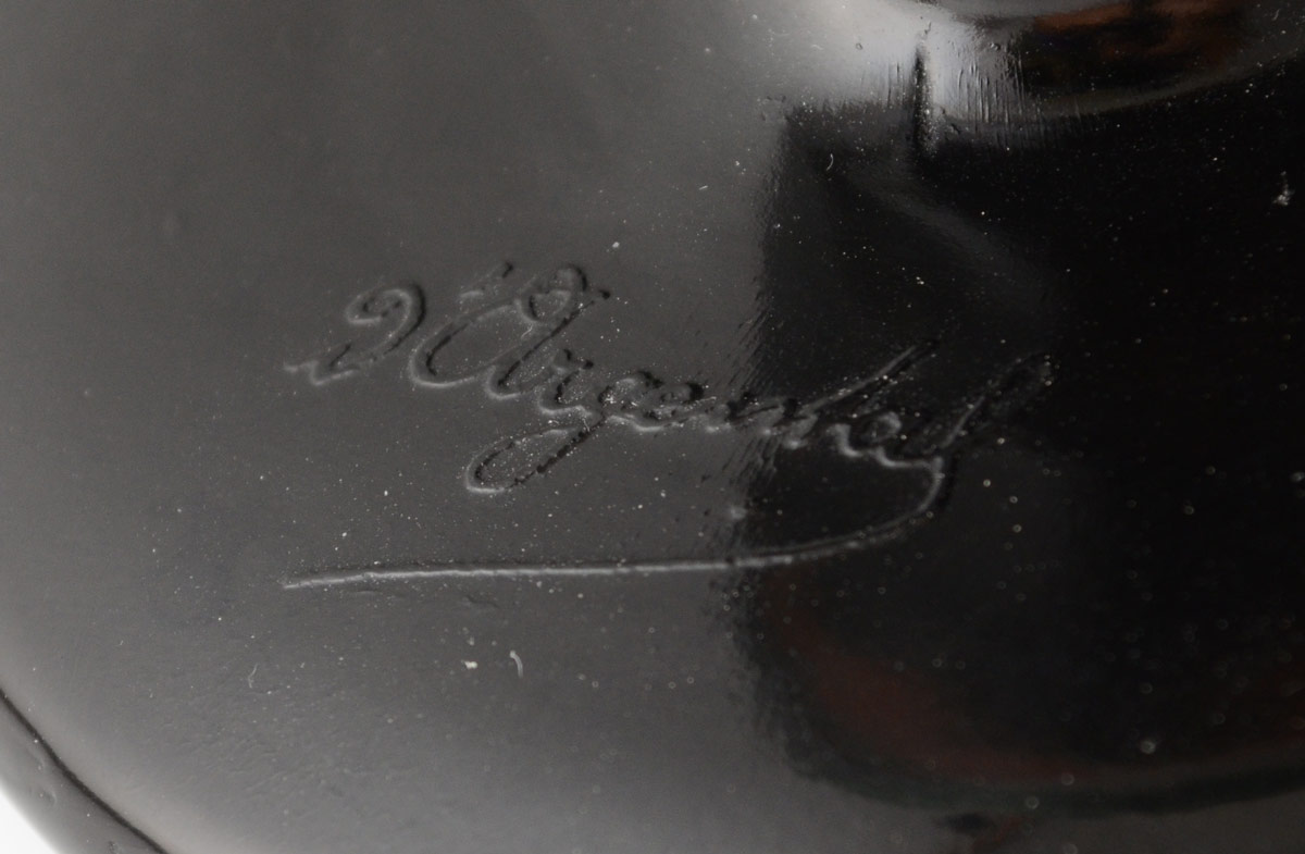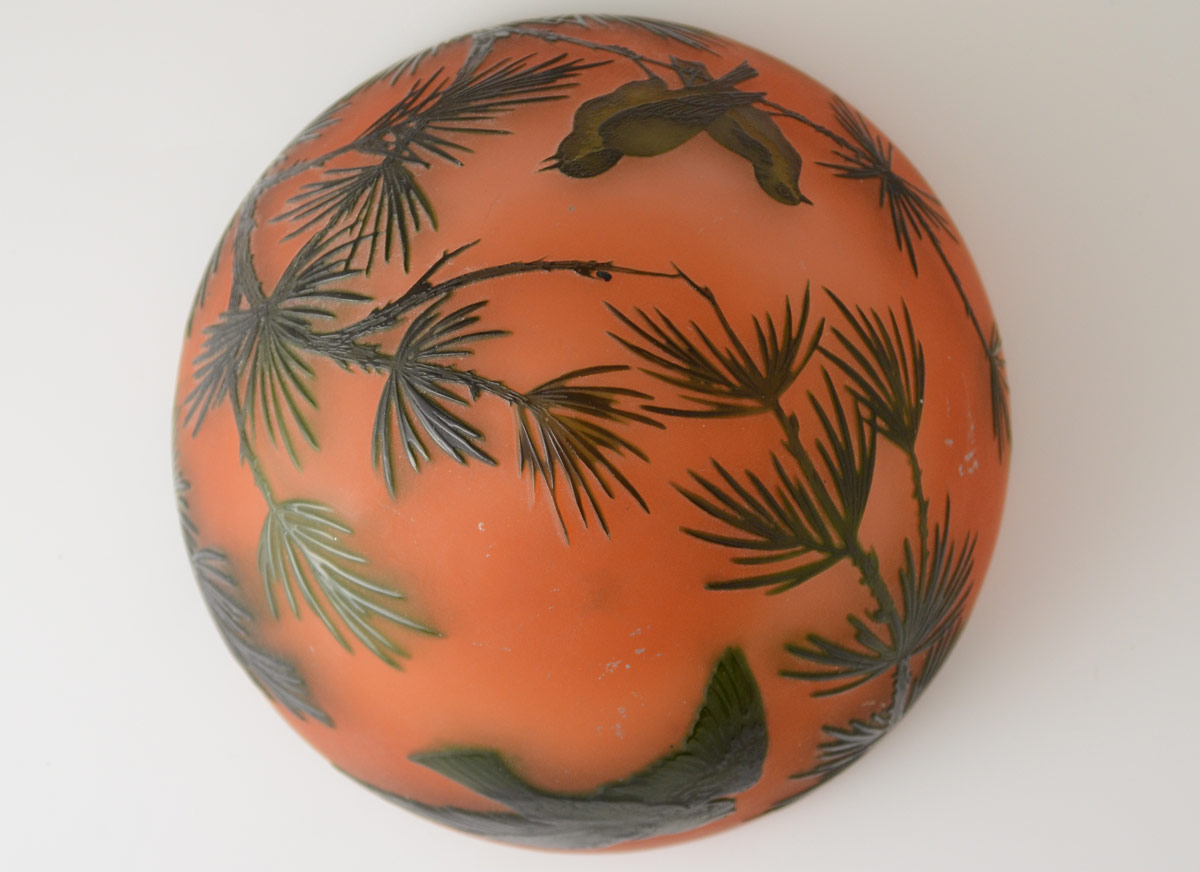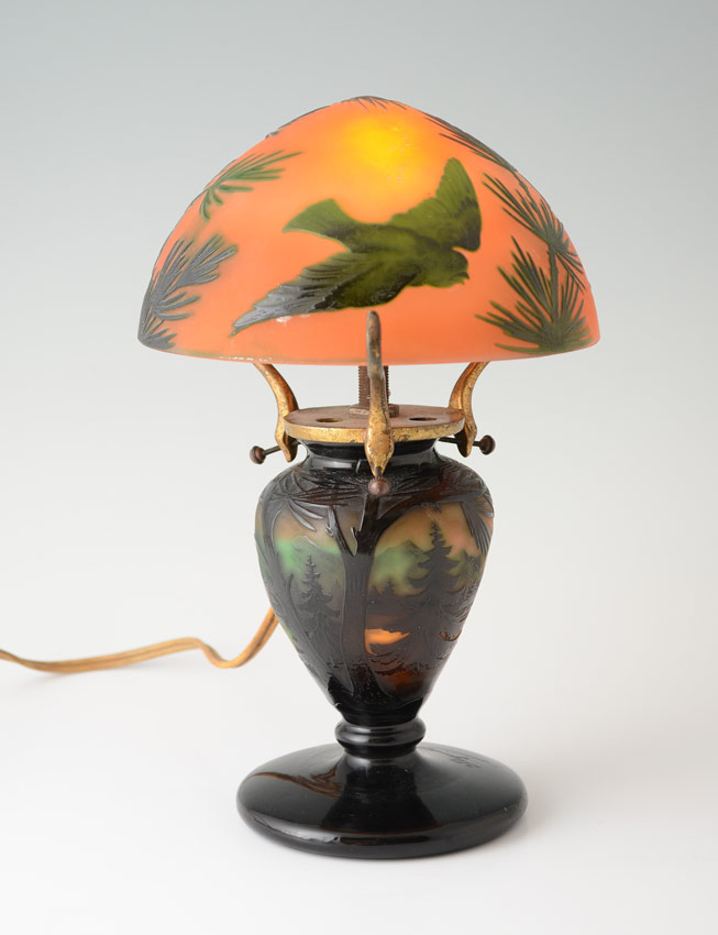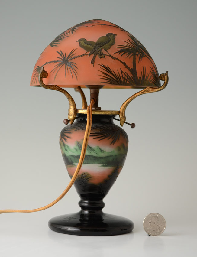 D'ARGENTAL FRENCH CAMEO GLASS LAMP: Diminutive in size. Dark green cut to a sunset coral color, in a pine tree landscape design that follows through on the domed shade cut in a pine branch and bird motif. 9'' tall, shade is 5 5/8'' dia. Signed on the base.
