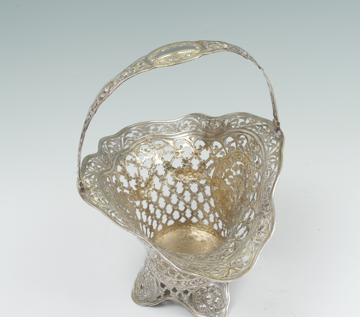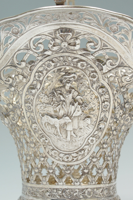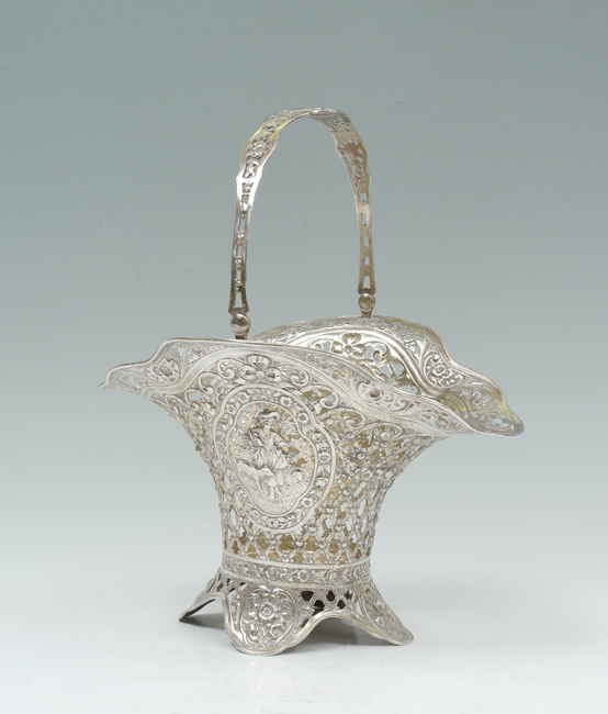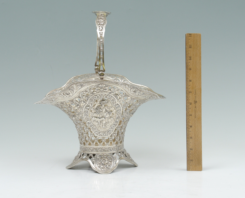STERLING RETICULATED BASKET: Articulated handle, reticulated body with embossed medallion featuring a maiden with a basket of flowers and a lamb. Marked on base Sterling 930. Overall measures 9'' h. x 12'' x 10 1/4''. Approx. 31.7 troy oz.