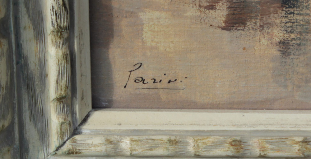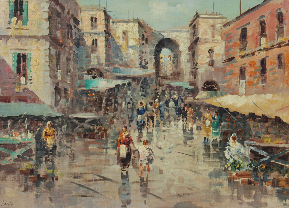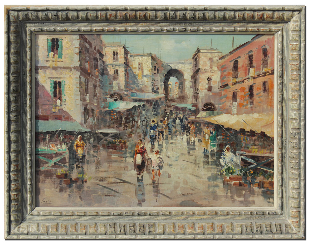 ITALIAN MARKET PAINTING SIGNED PASINI: Oil/Canvasboard, 19 1/2'' x 27'', signed lower left, encased in carved and painted frame 25 1/2'' x 33 1/4''.
