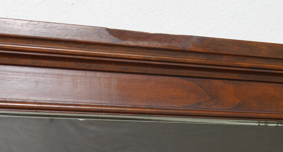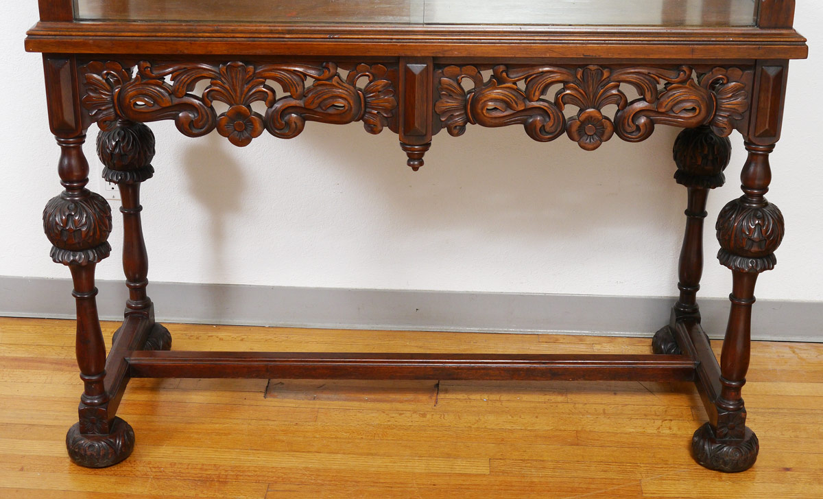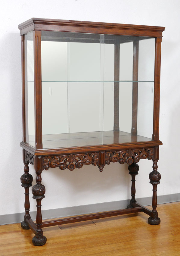 EARLY 19TH C WALNUT DISPLAY CABINET: Elaborate carvings under the glass doors. Mirror back interior with a single glass shelf. Acquired from a pre demolition Tiffany shop in New York city. 78 1/4'' h. x 52 1/4'' x 20 1/2''.