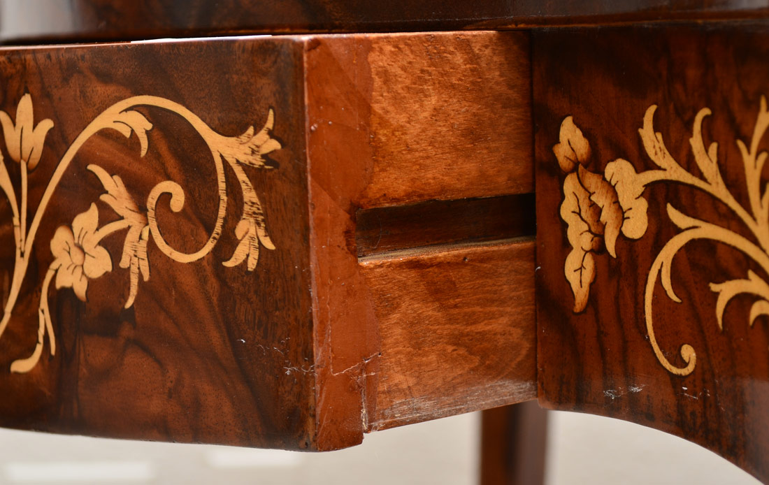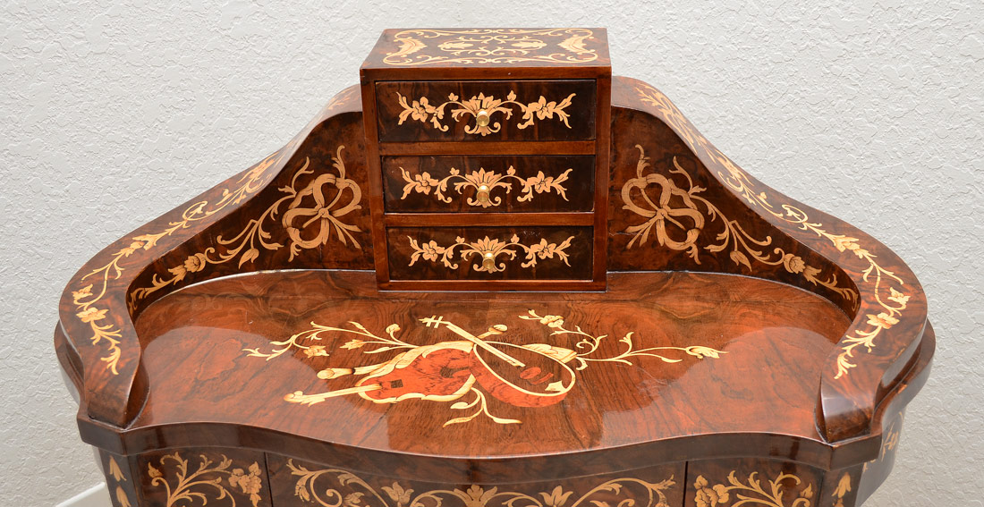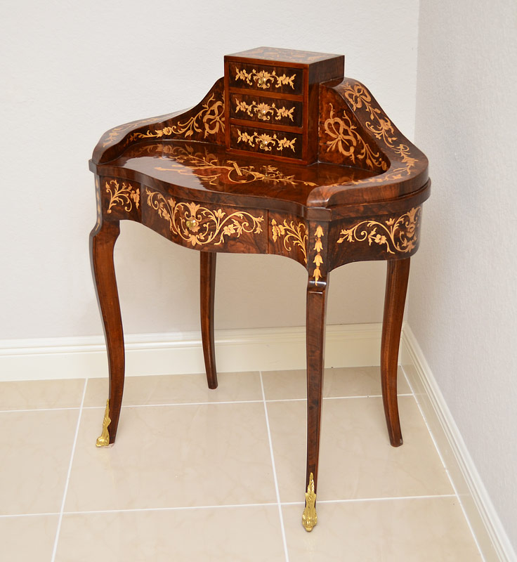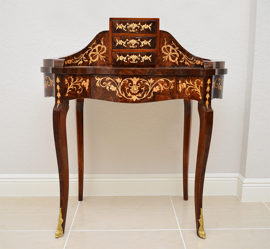 ITALIAN MARQUETRY INLAID LADIES WRITING DESK: Shaped top with 3 central drawers, serpentine front, shaped legs with ormolu mounts on front feet. Floral marquetry inlay all over with musical instrument on writing surface.