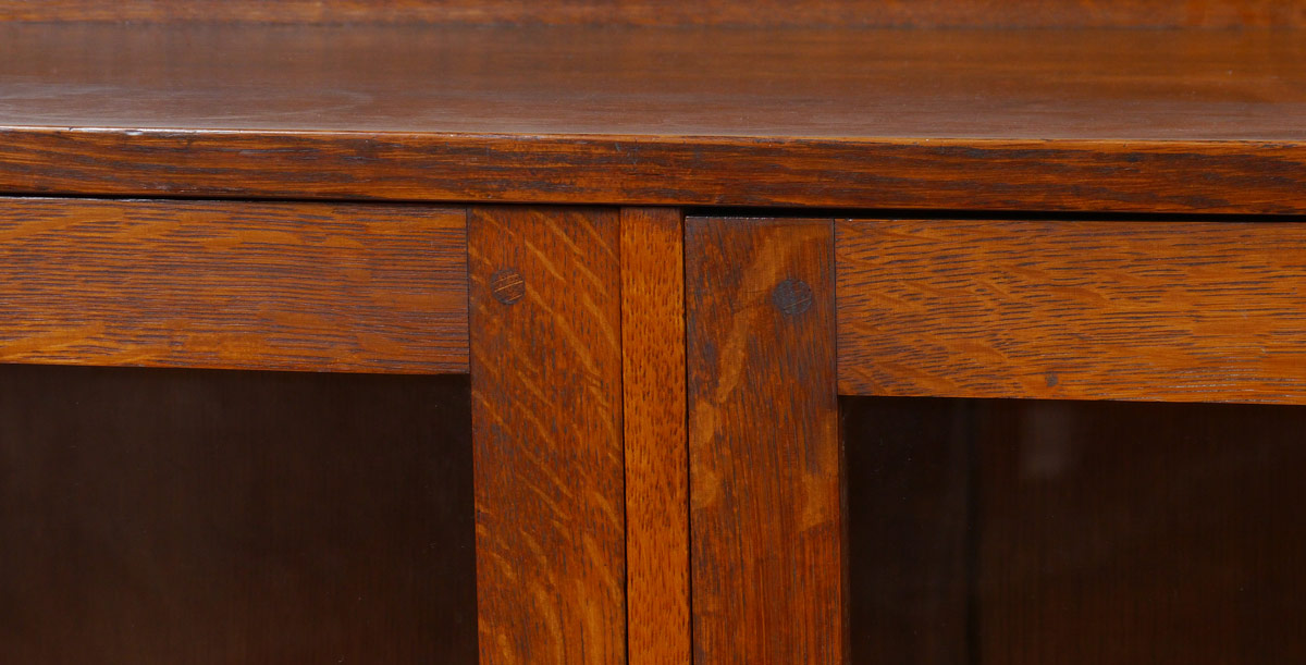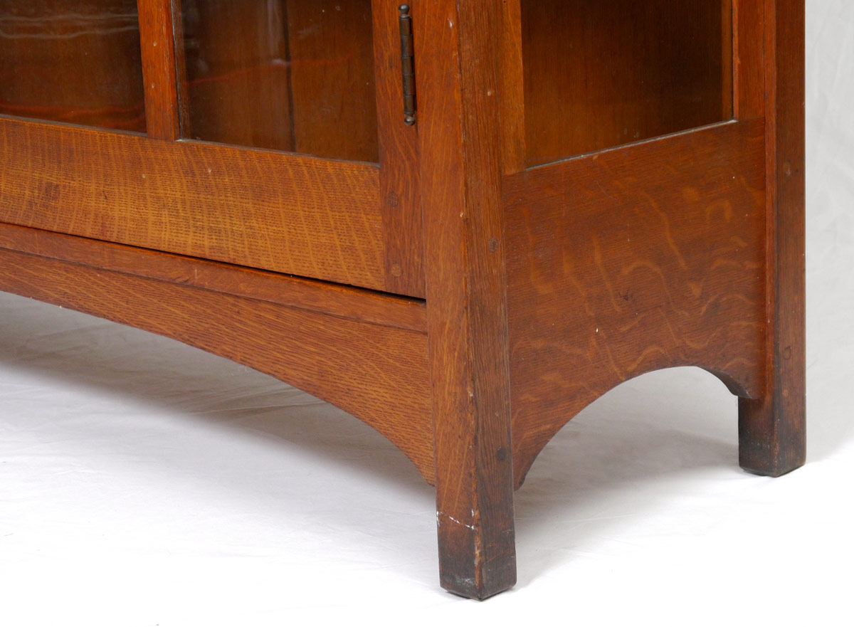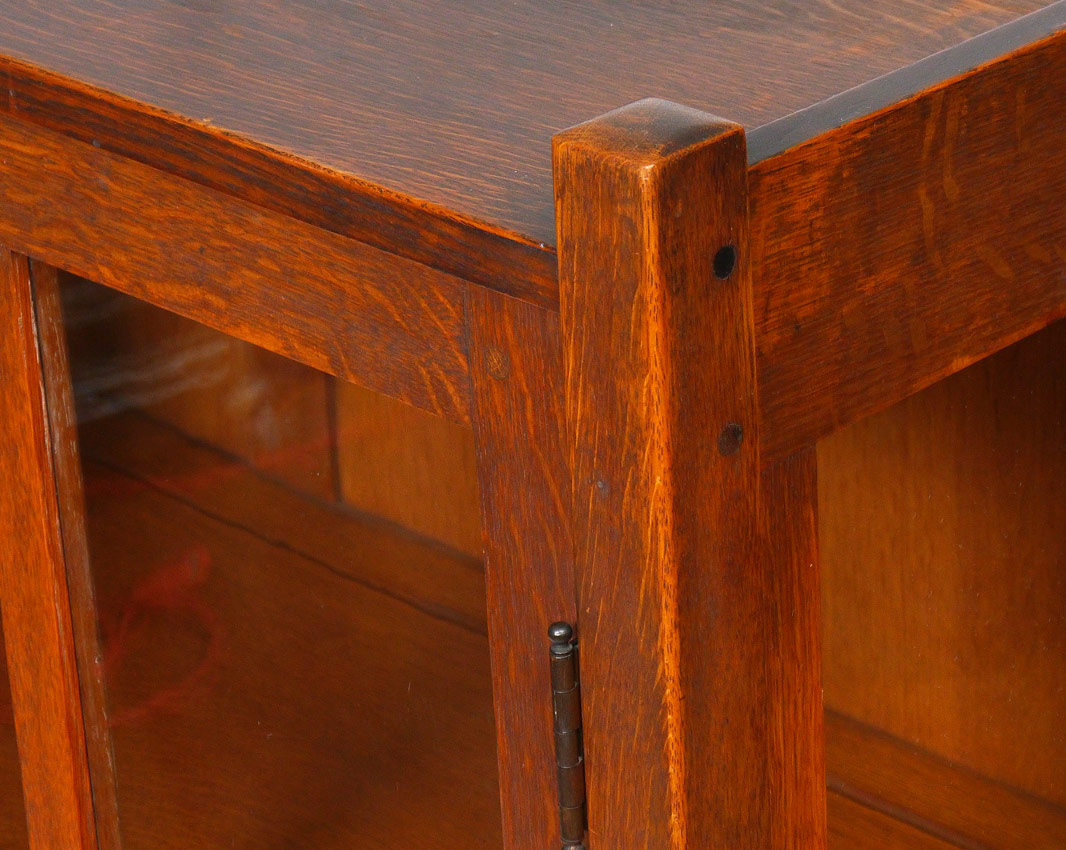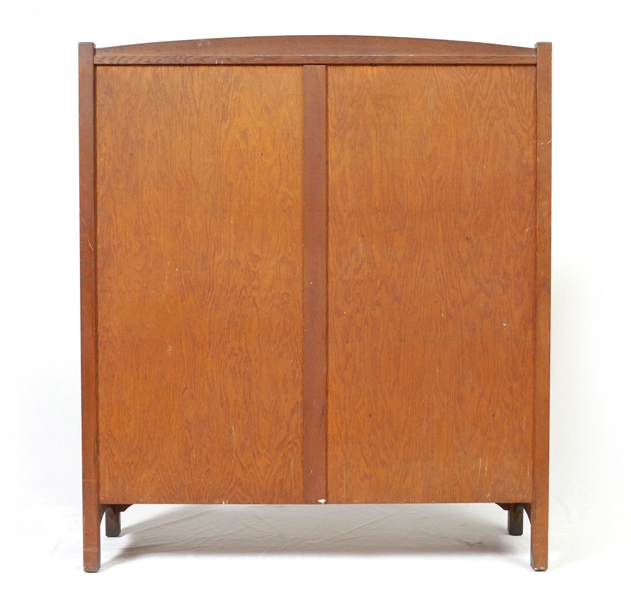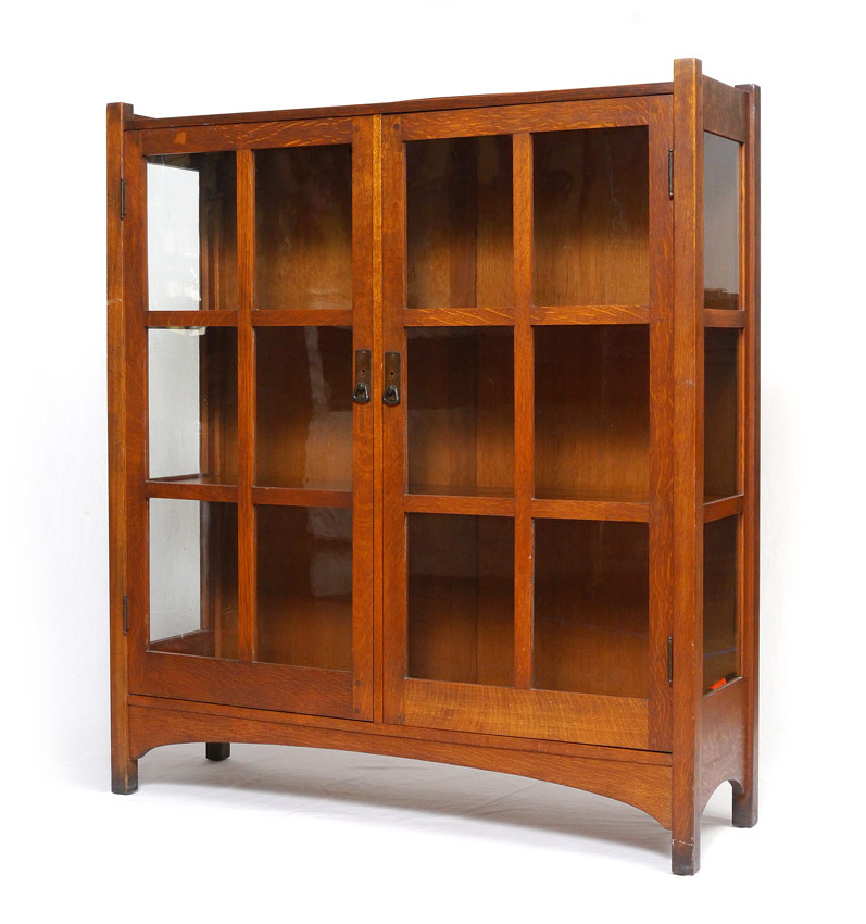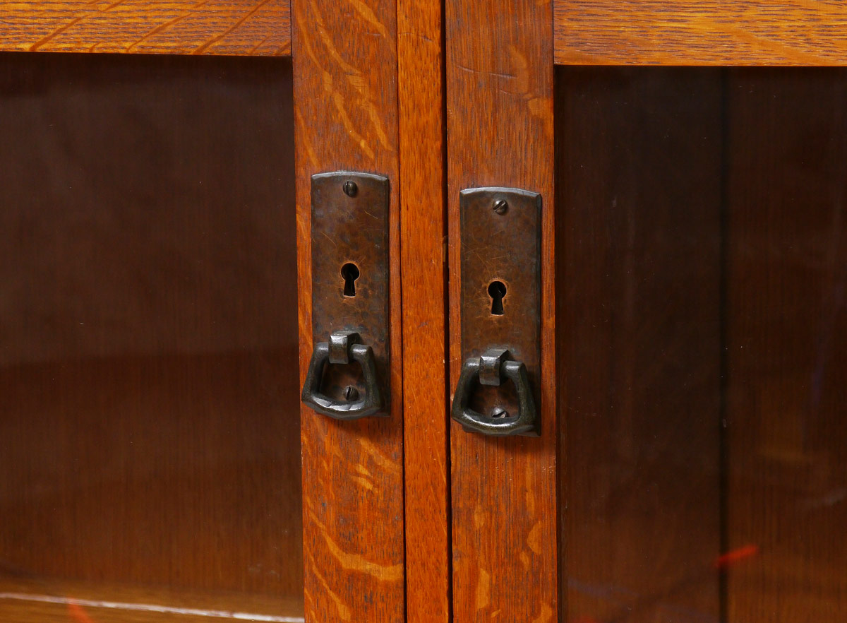 L & JG STICKLEY MISSION CHINA CLOSET 728: Oak cabinet, original hardware with key. Interior shelves with plate grooves. Six panes of glass on each door, three panes down each side. Measures 55''h. x 48'' x 15''.