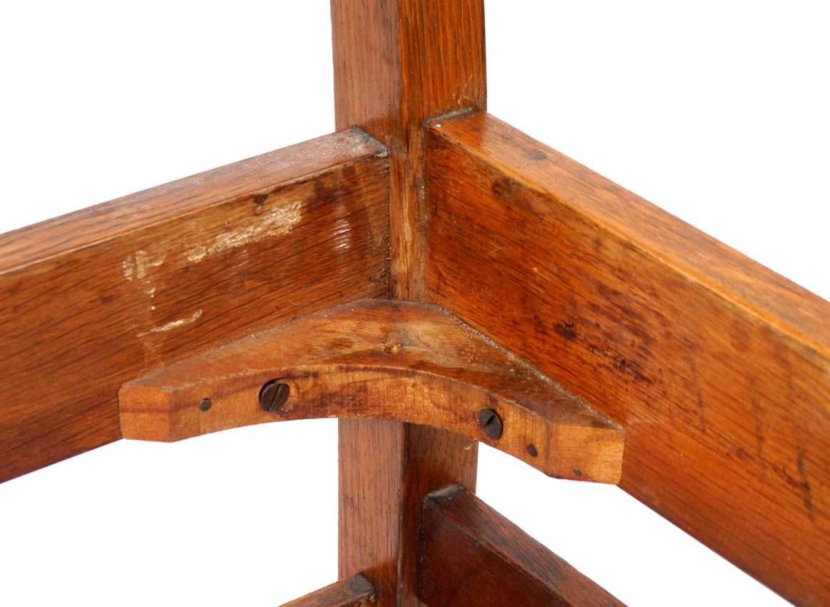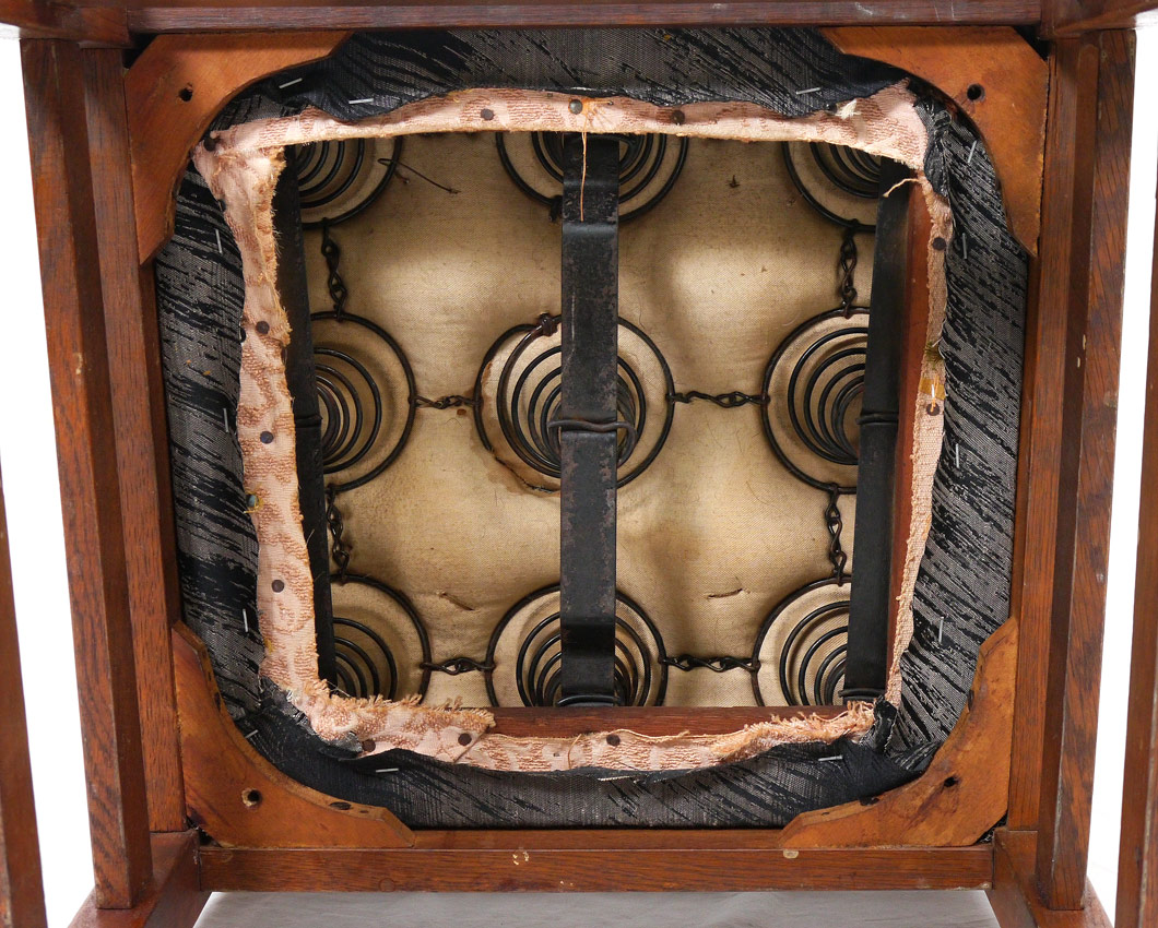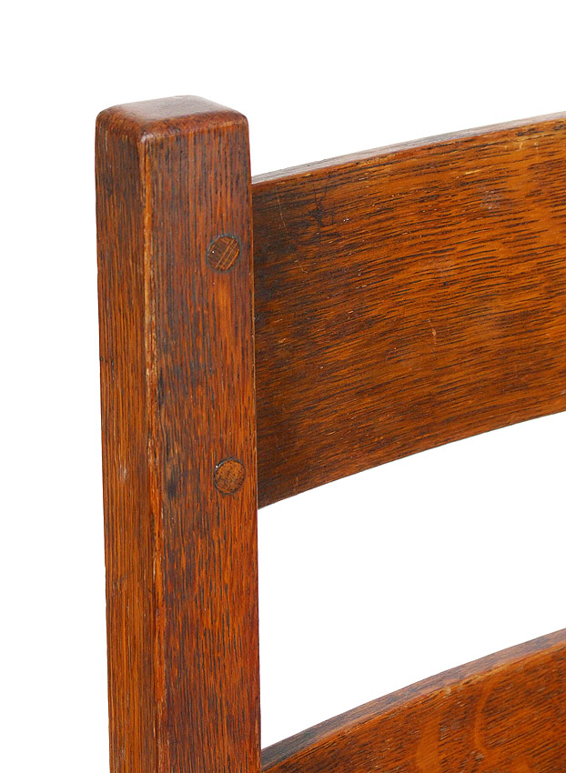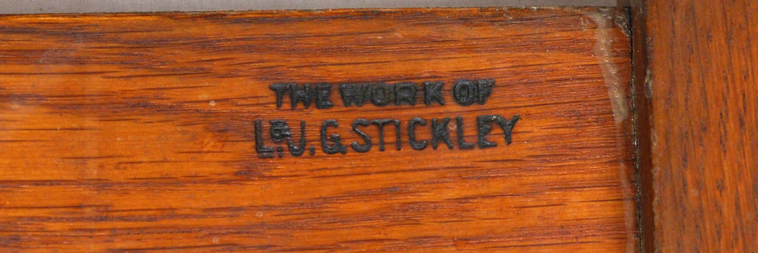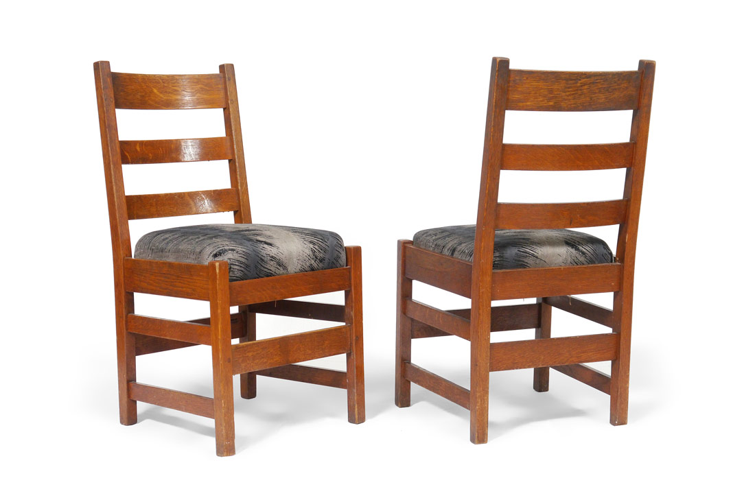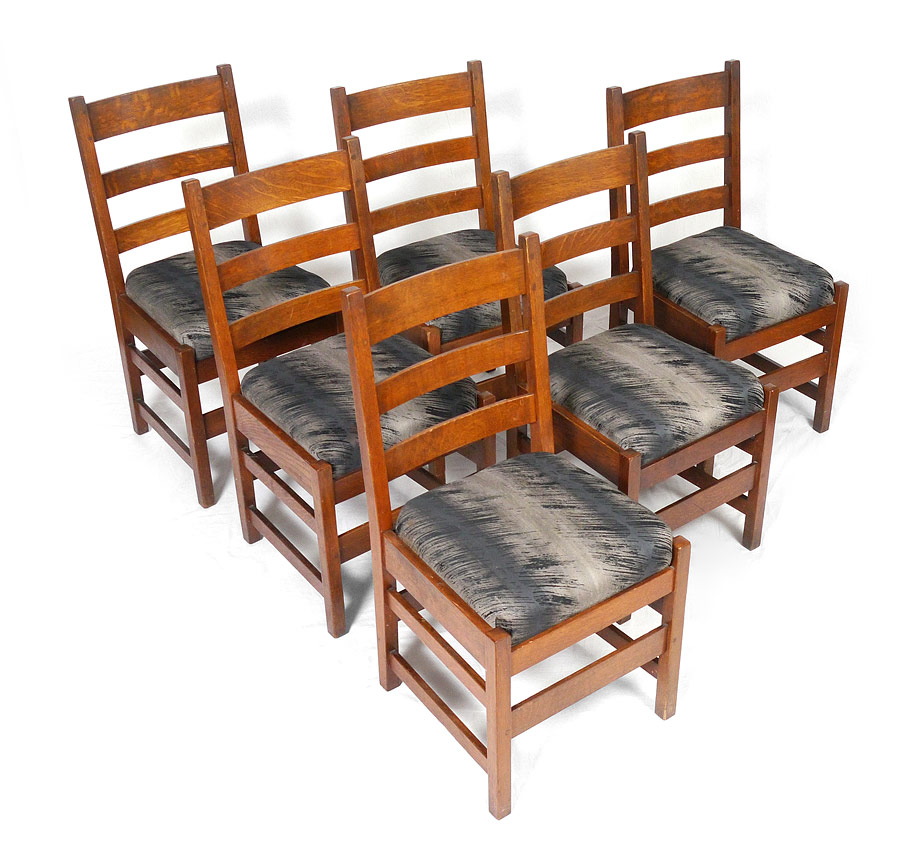 L & JG STICKLEY SET OF 6 OAK DINING CHAIRS: Slat back side chairs, recovered seats, thru peg construction. Signed ''Work of L&JG Stickley''. Measures approx. 36'' tall x 18'' x 17''.