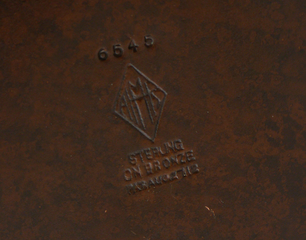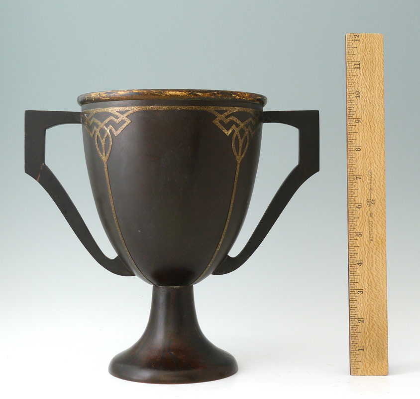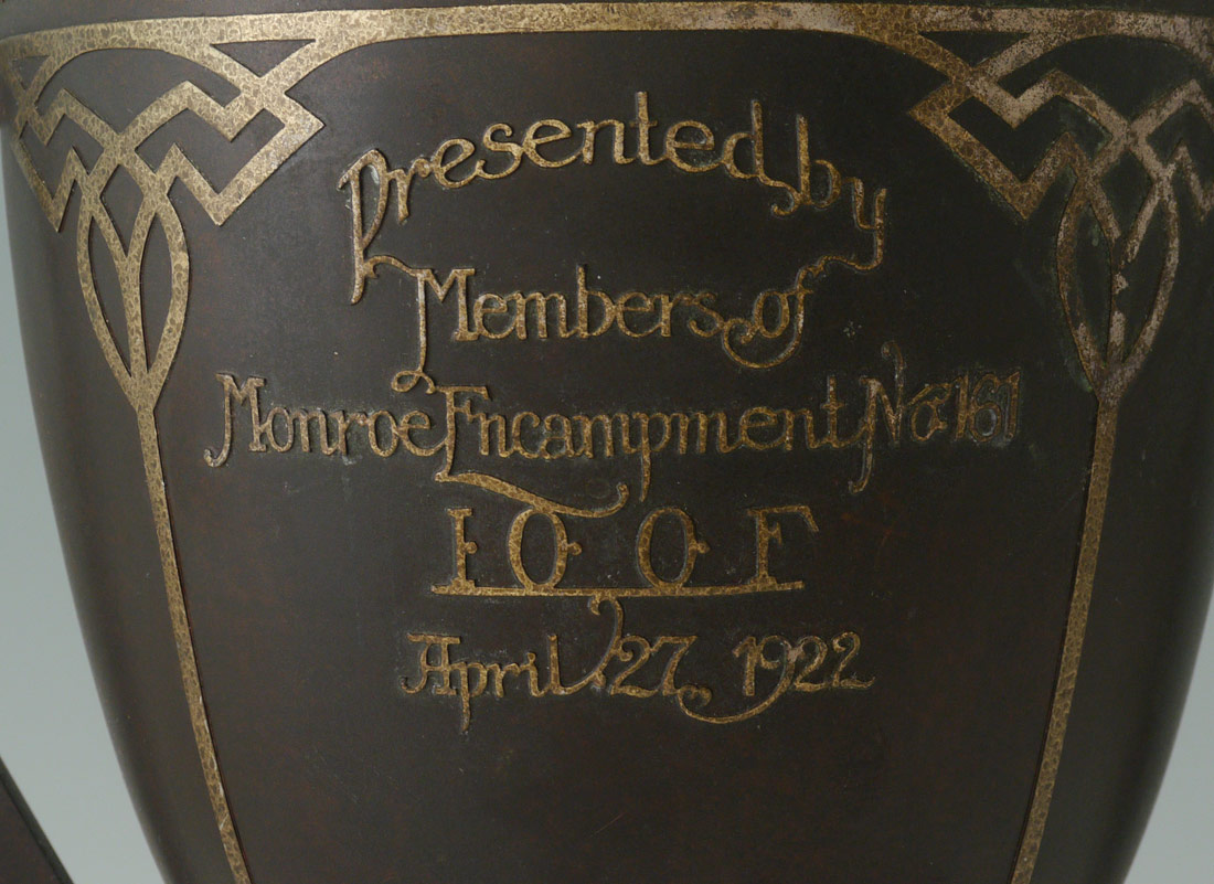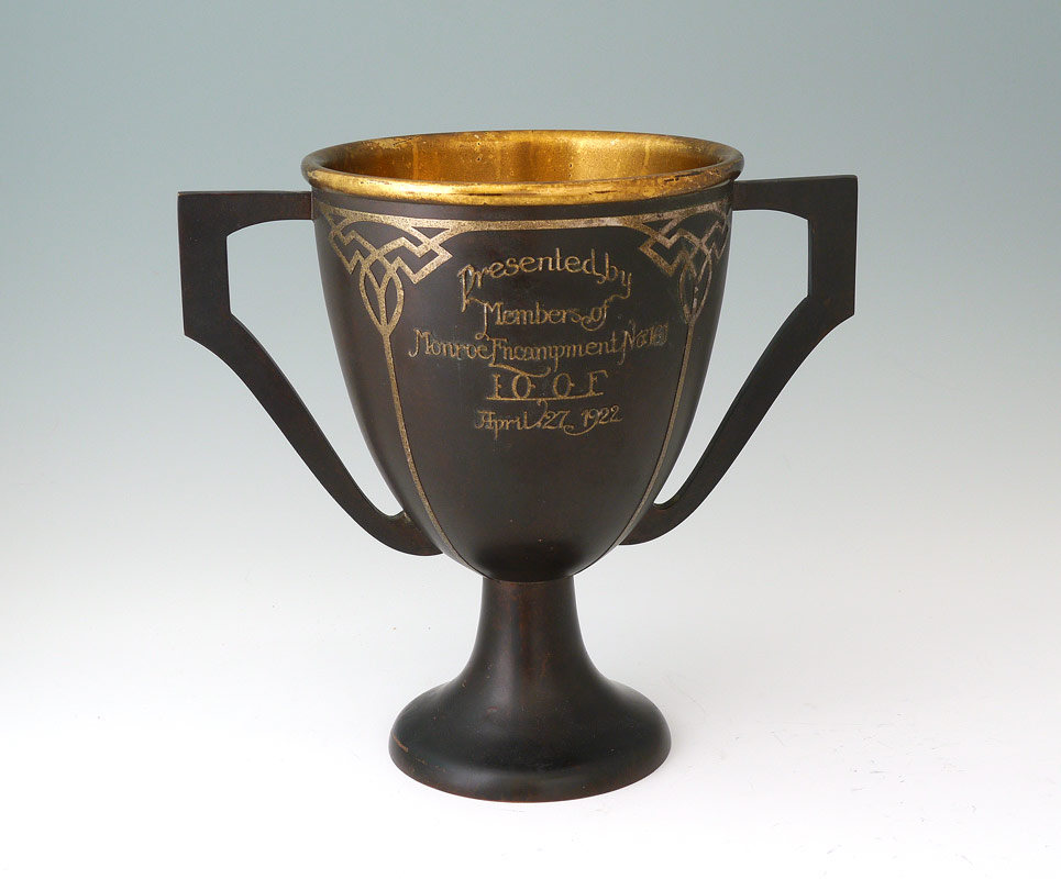 HEINTZ ART METAL ODD FELLOWS PRESENTATION LOVING CUP: Sterling on bronze with vermeil interior, presentation reading ''Presented by Members of Monroe Encampment No. 161, IOOF, April 27, 1922''. Marked on base with 6545, Heintz mark, Sterling over Bronze, Pat Aug2712. 10'' h. x 10 1/2'' x 7''.