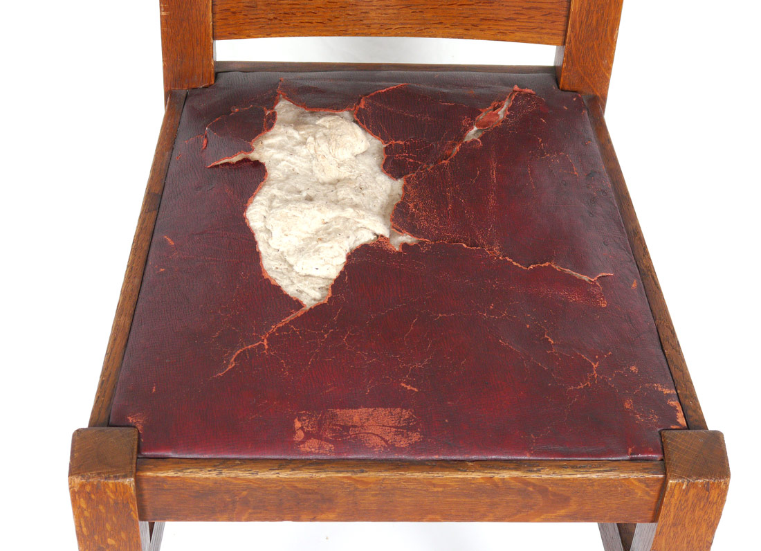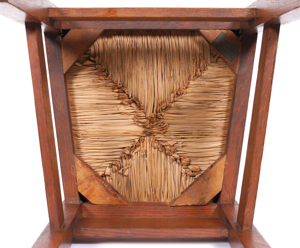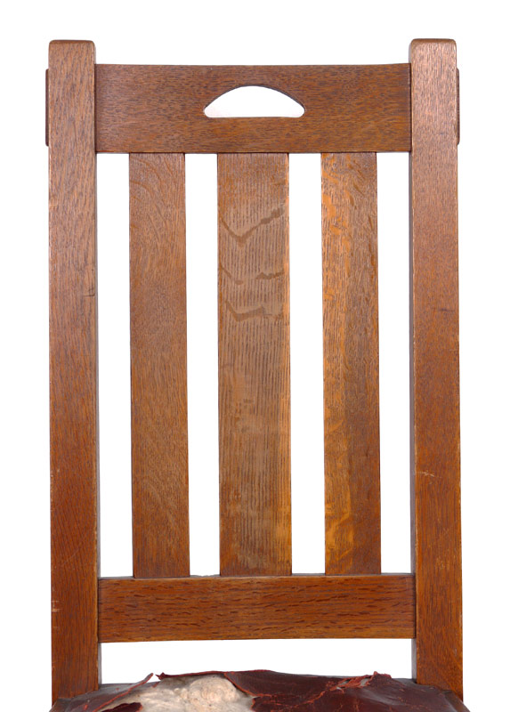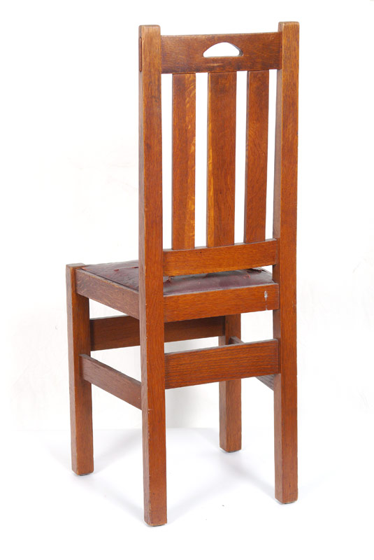 STICKLEY QUAINT FURNITURE SIDE CHAIR: Mission oak chair, original metal tag ''Quaint'' Furniture, Stickley Bros., Grand Rapids, Mich. Stamped inside front rail 952 X 825 1/2. Measures 38'' x 15 3/4'' x 16''.