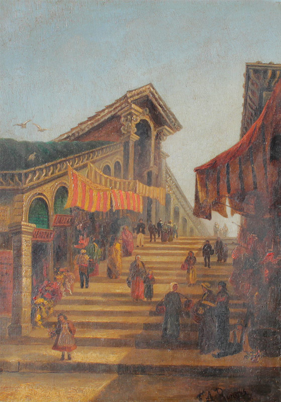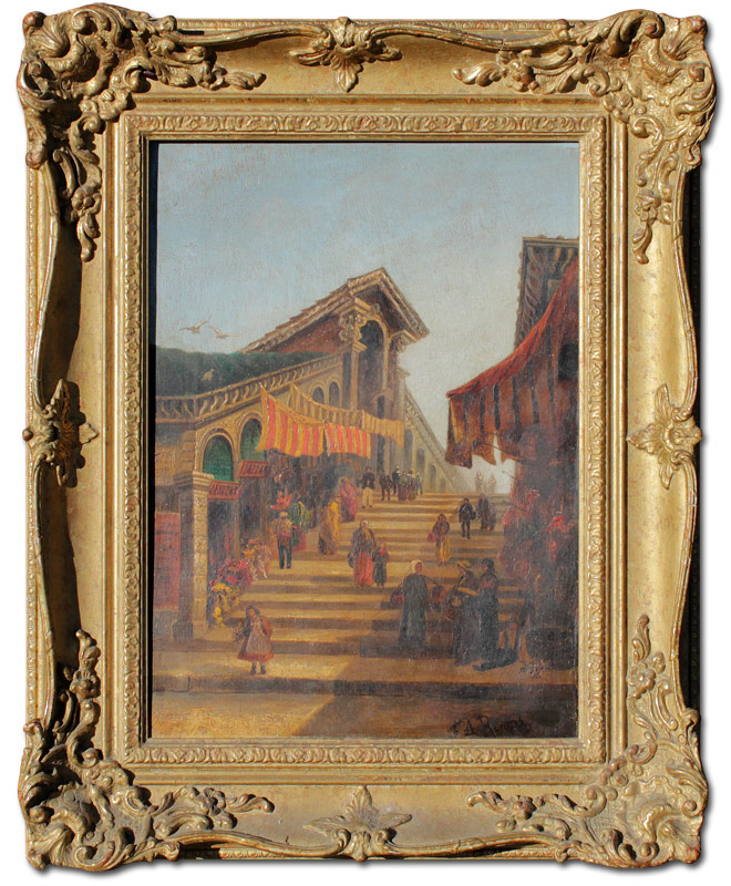 RINGER, Frederica A., (British, 20th Century): ''Steps of Ponte di Rialto'', Oil/Canvas, 15'' x 11'', signed lower right, encased in a gilded gesso frame showing wear and several bits of gesso 20 3/4'' x 16 1/2'' x 2''.