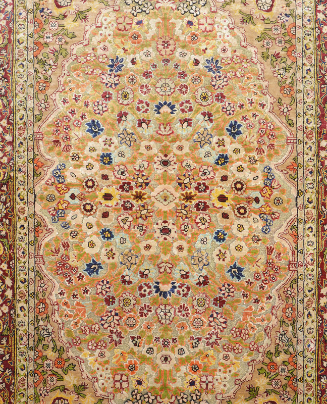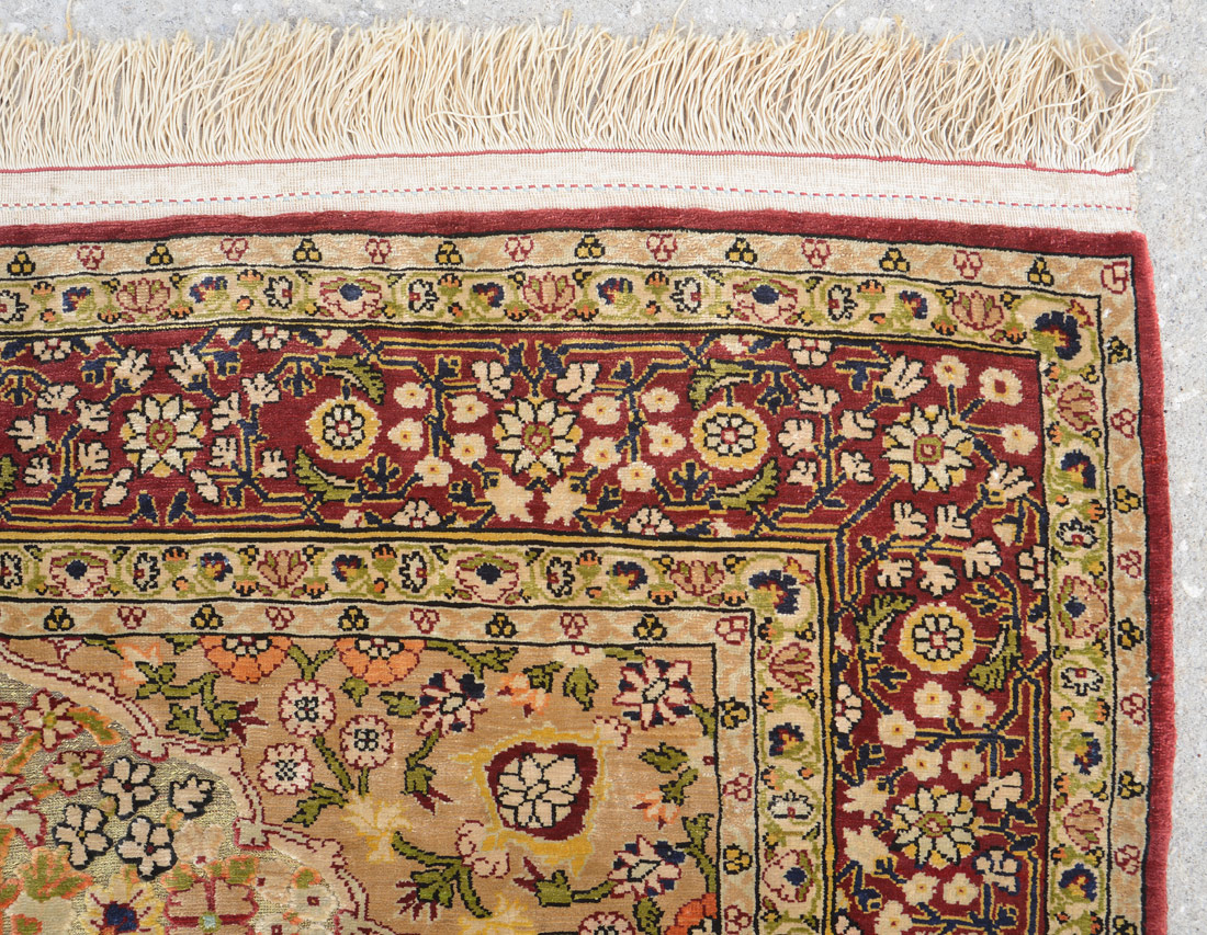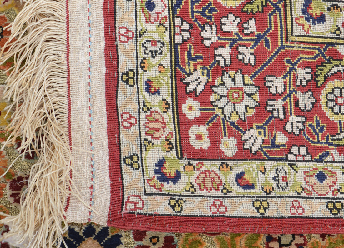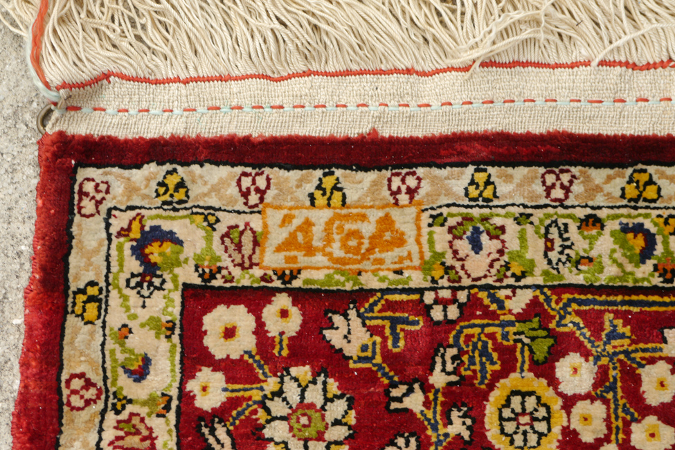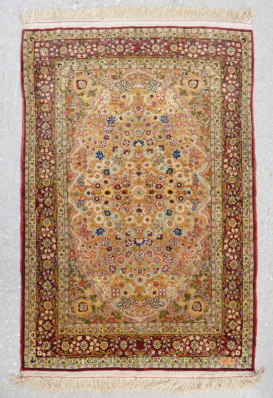 SIGNED HEREKE? HAND KNOTTED RUG, 2' 4'' x 3' 4'': This finely woven rug has an allover ''mille fleur'' (thousand flowers) design. The small flowers that cover the light ground field are in colors of peach, yellow, green, white, and some burgundy accents. The four white ground guard borders and the burgundy red main border nicely frame the field that looks like a flower garden. Condition is very good. Signed in border. Approx. 25-35 yrs. old