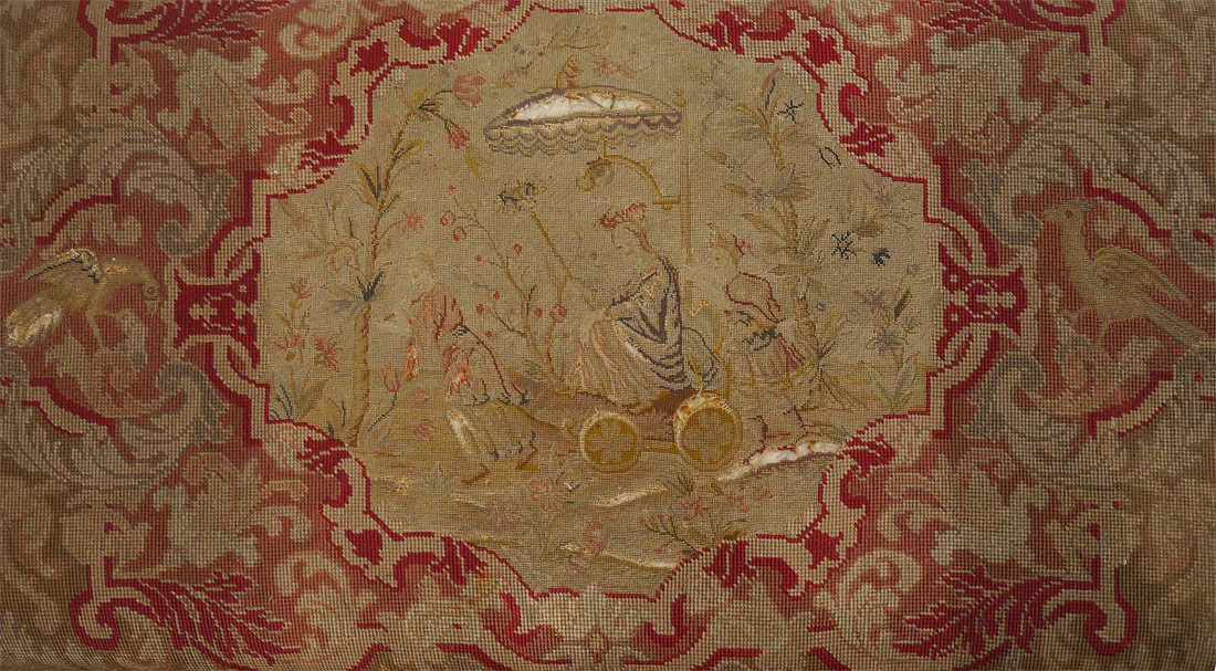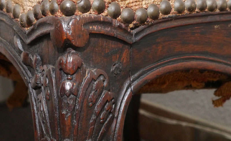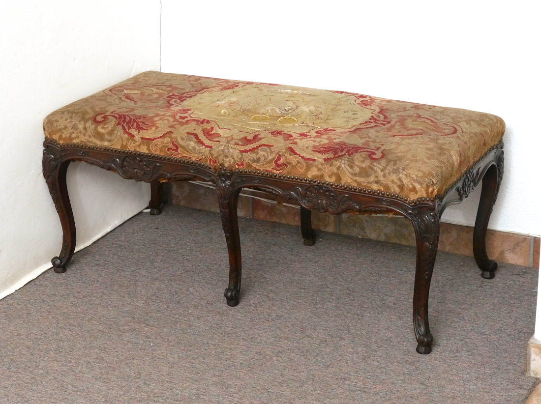 LOUIS XV STYLE HALL BENCH: Carved and shaped mahogany skirt and legs with original worn condition needlepoint seat. Mortice and tenon joint construction. 19 1/4'' h. x 46 1/2'' x 22 1/2''.