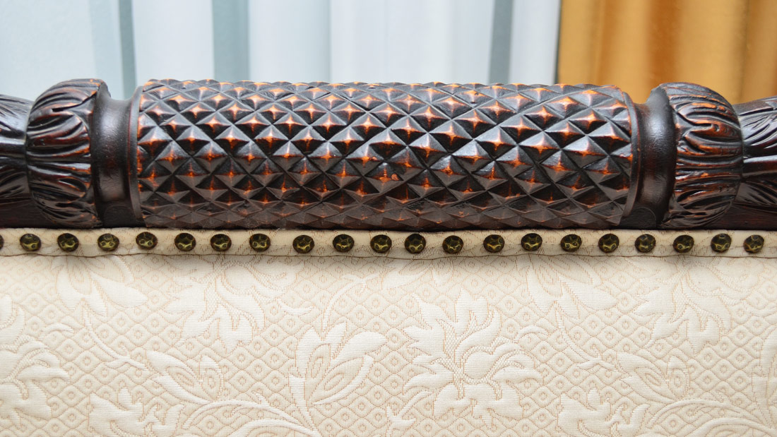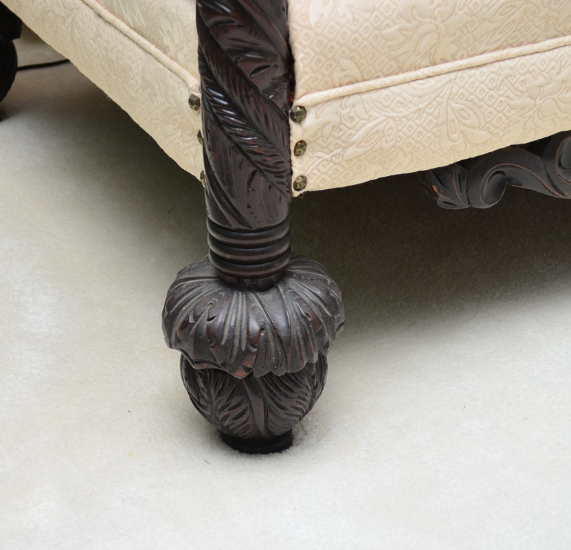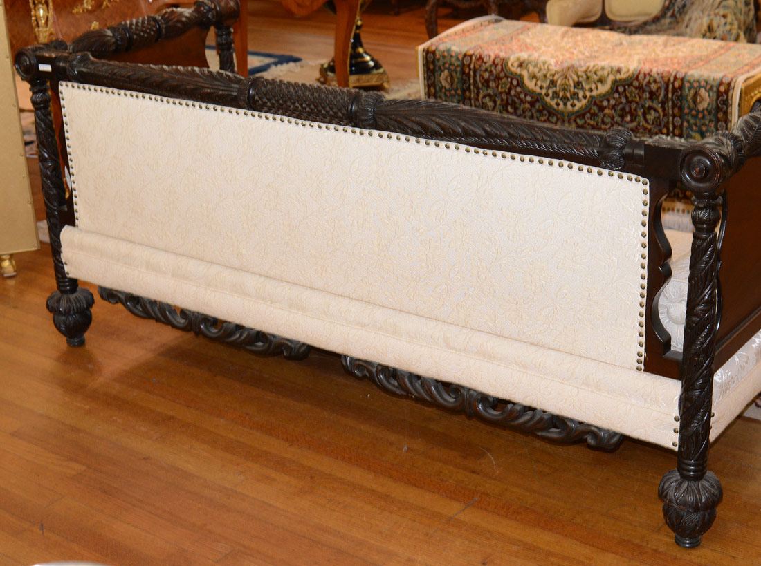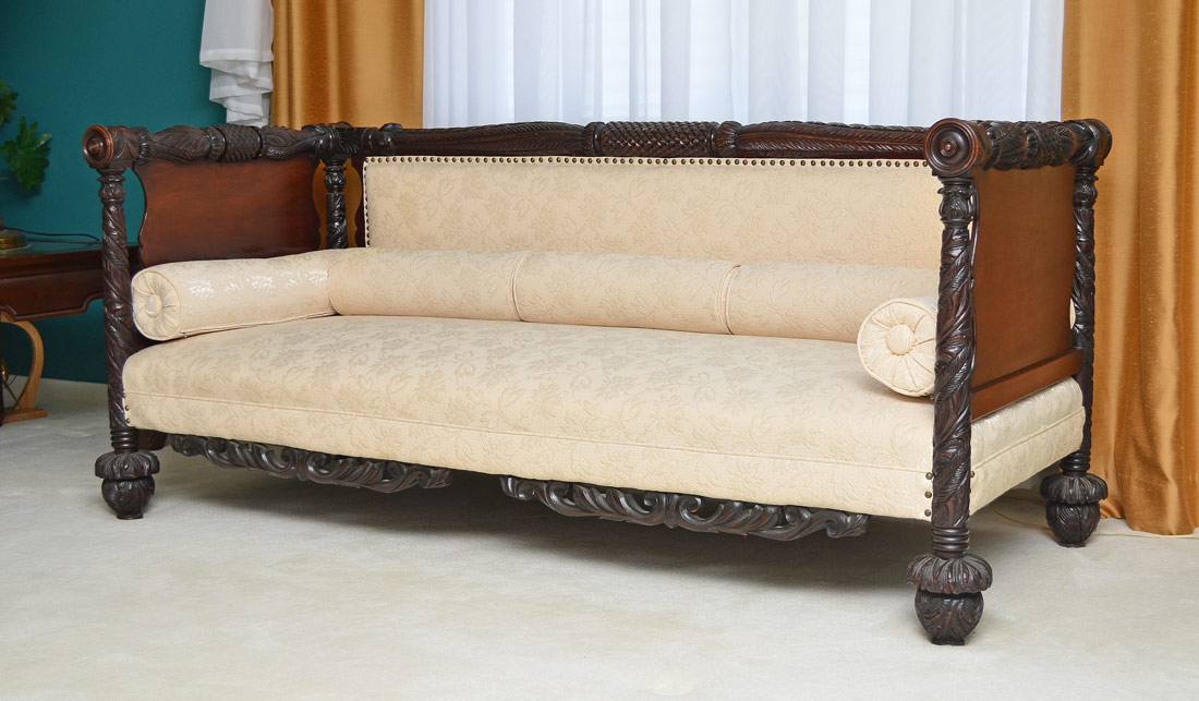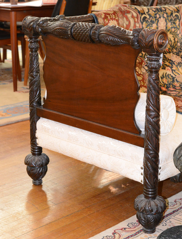 19TH CENTURY FEDERAL OR EMPIRE CARVED SETTEE: Profusely carved all over with geometric and foliate motifs, pierced skirt, stylized acorn feet. Tacked patterned ivory color upholstery, 5 cylinder throw pillows. 33'' x 76'' x 32 1/2''.