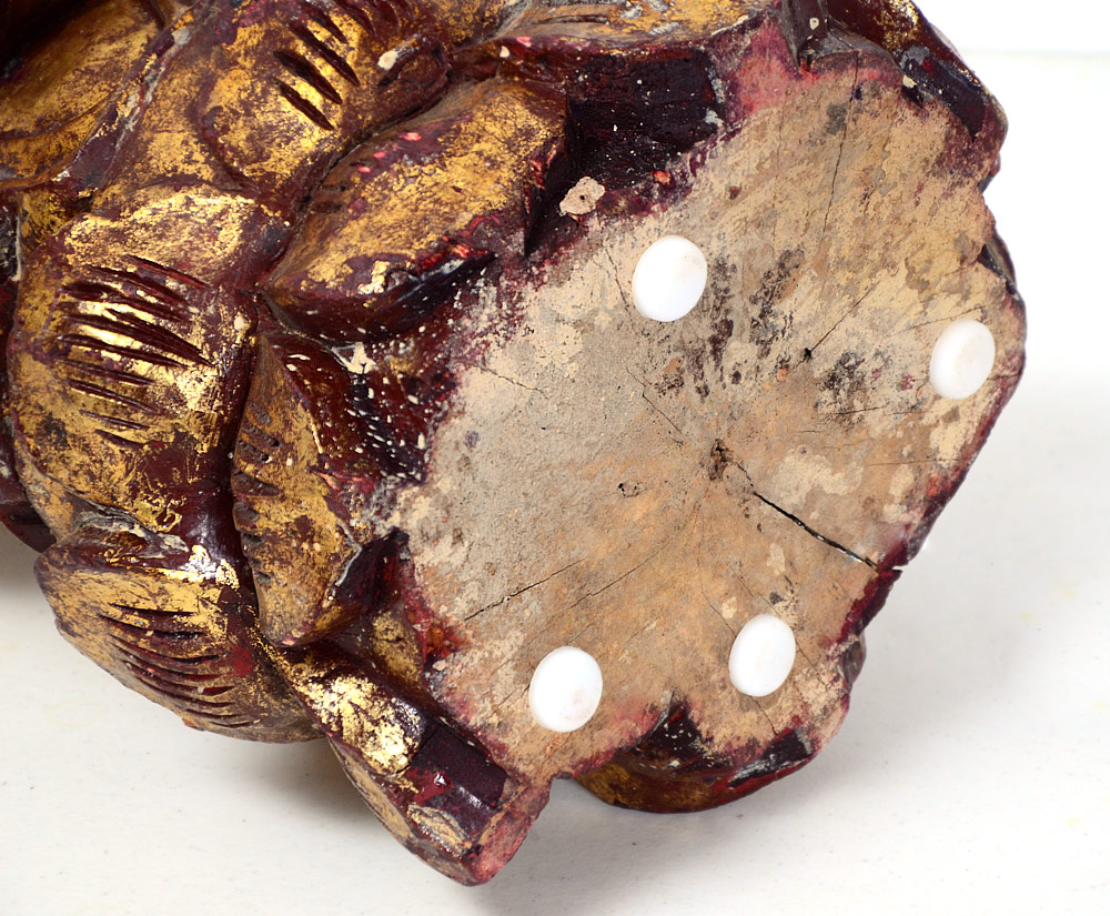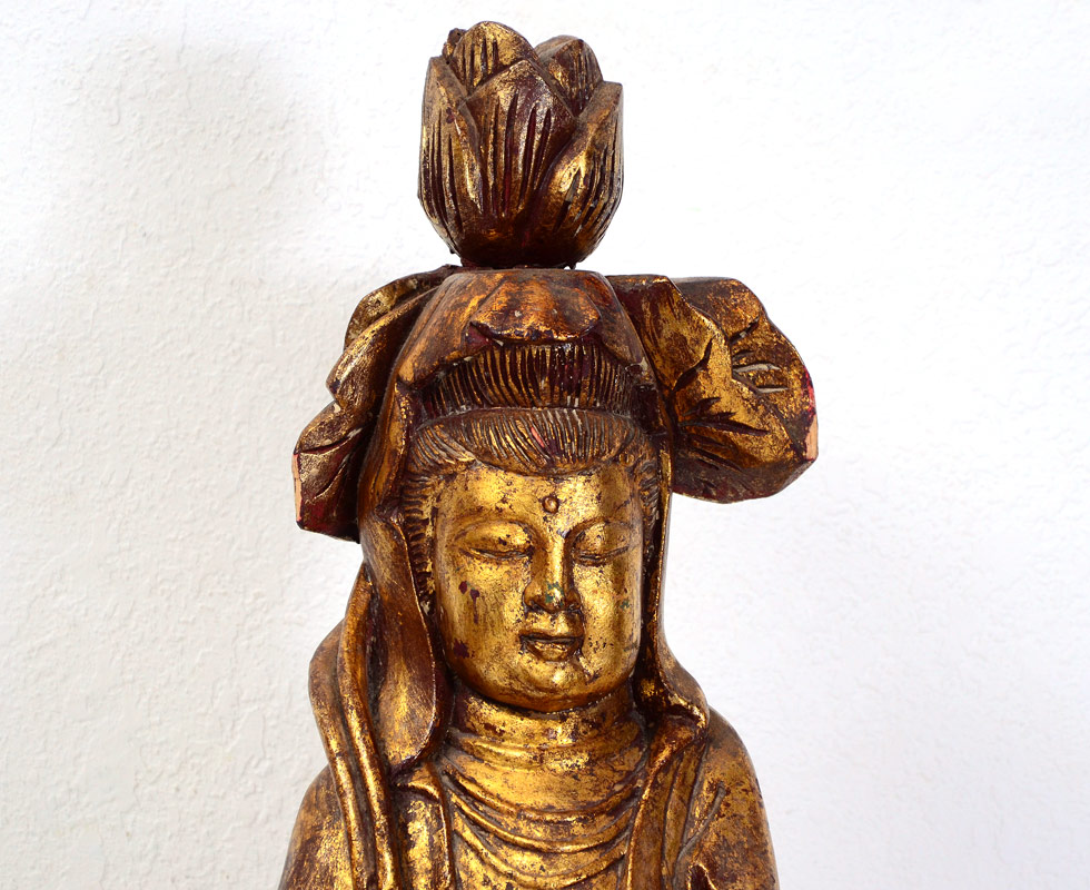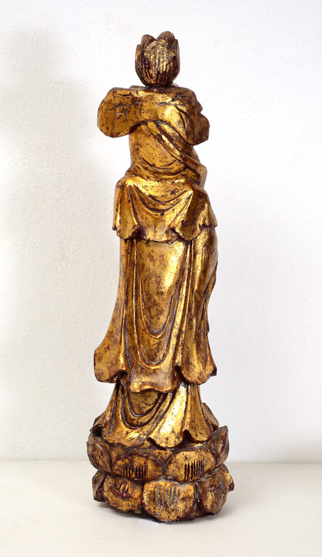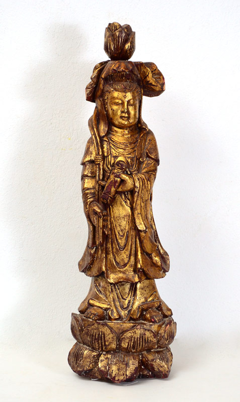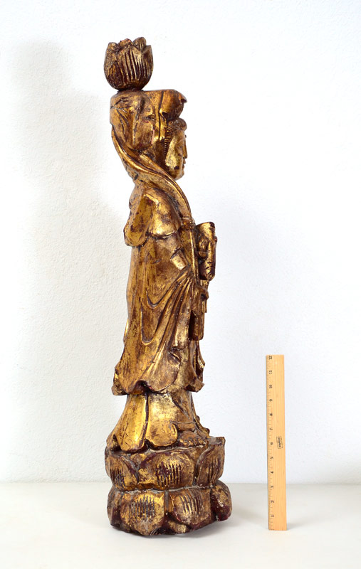 LARGE CARVED & GILT WOOD QUAN YIN: Gilt over red lacquer, detailed carving of standing Quan Yin holding staff and scroll. Overall measures 34'' h. x 10'' x 9''.