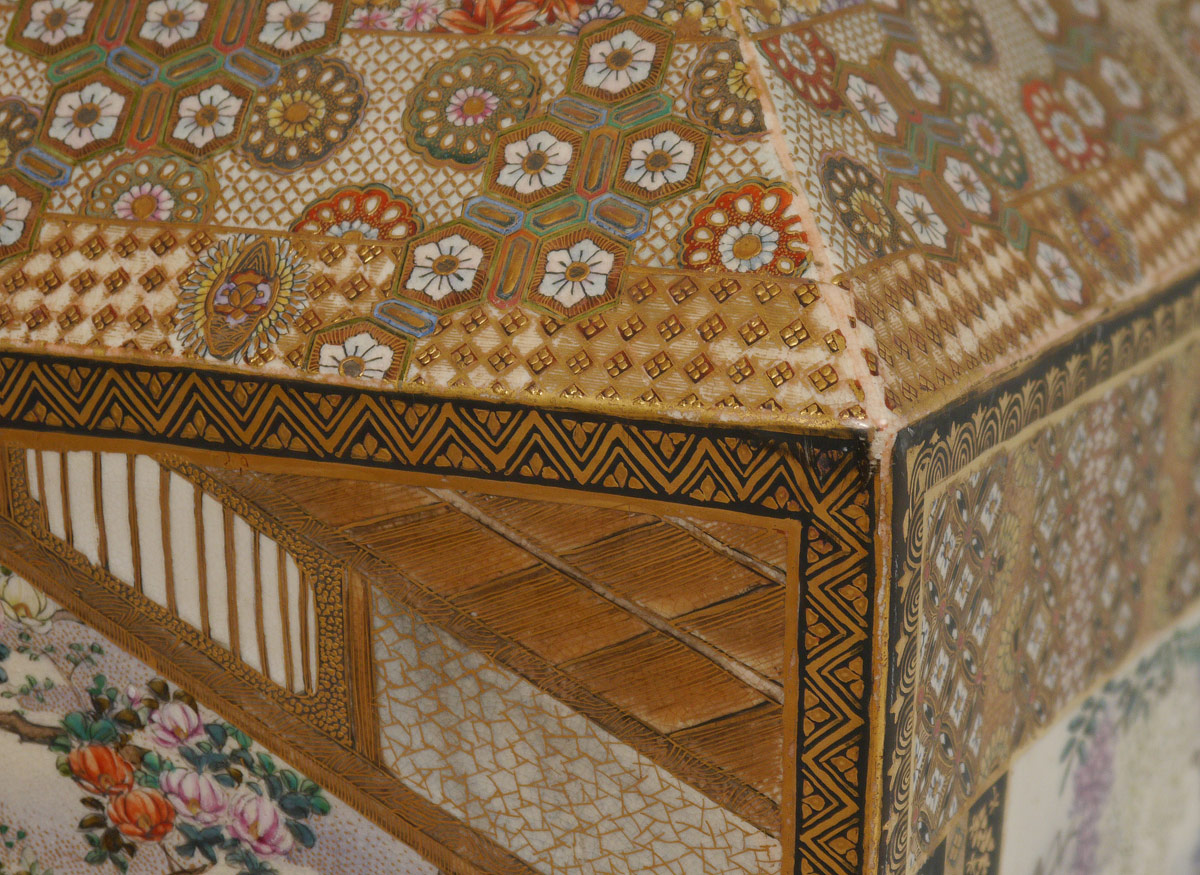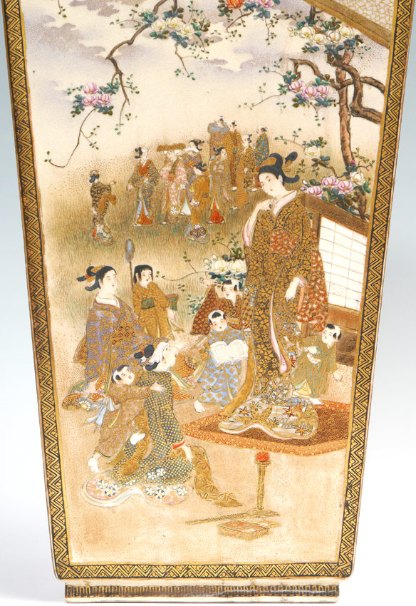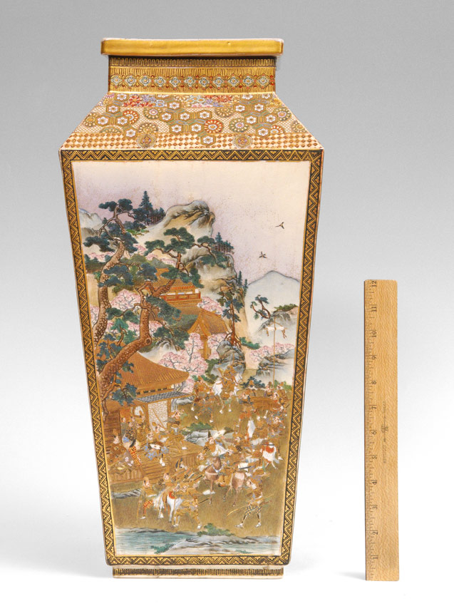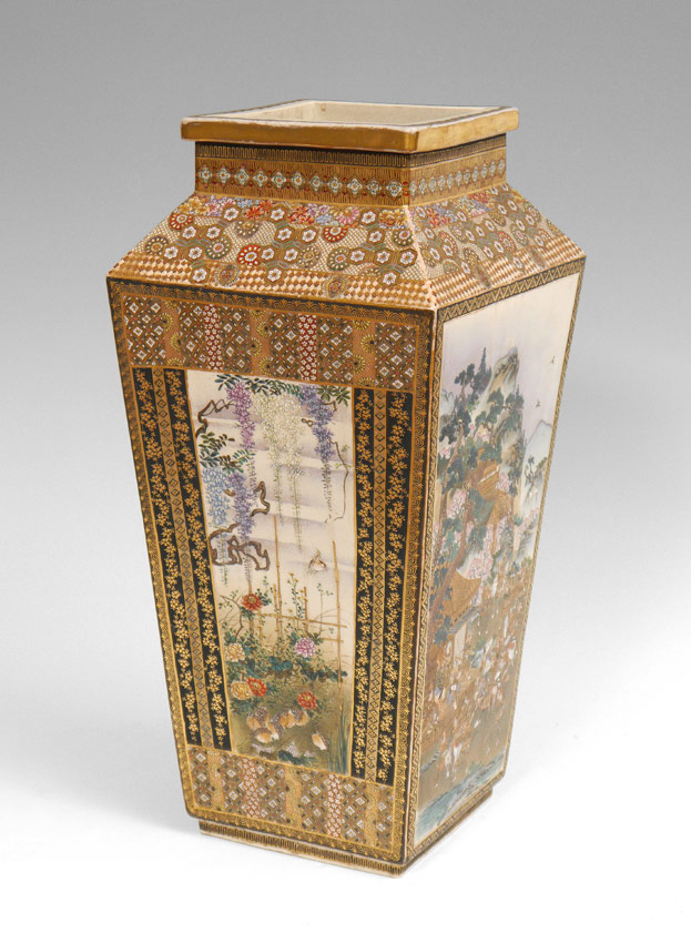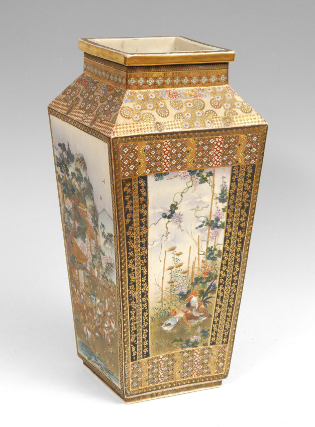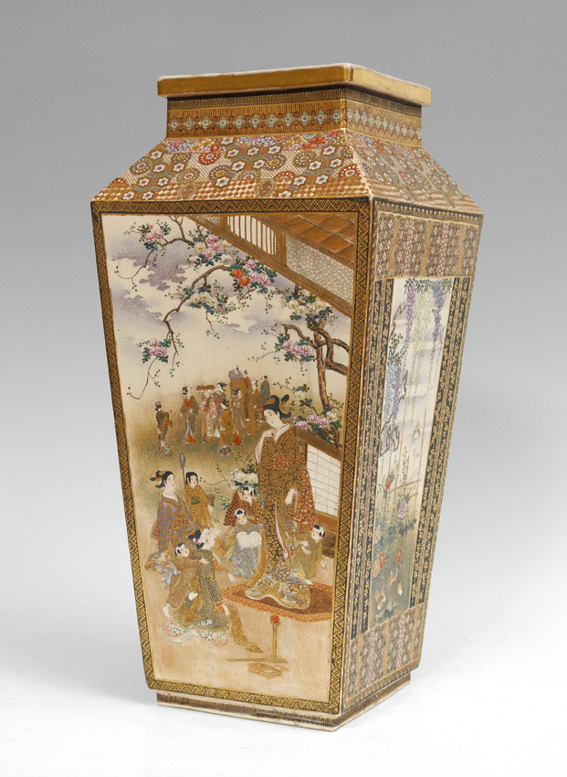 LARGE JAPANESE 4 SIDED SQUARE SATSUMA VASE: Profusely decoration with Japanese outdoor genre scenes, figures, Samuri scene, floral and geometric designs. Marked on base, one mark has been blacked out. Overall measures 21 1/2'' h. x 10 1/2''.