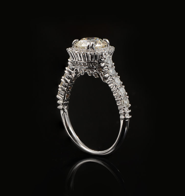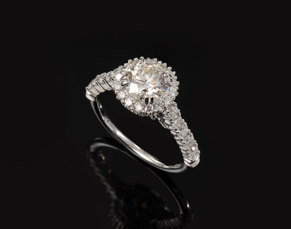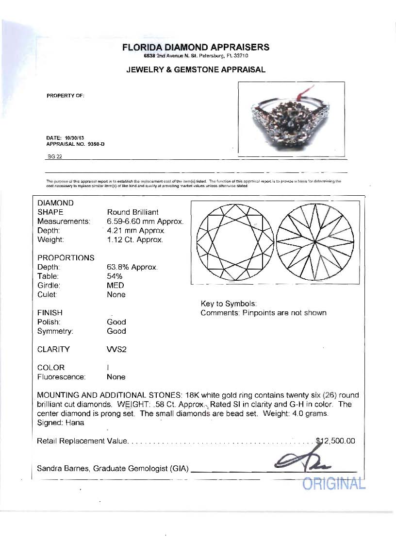 1.12 CT CENTER DIAMOND HALO RING: 18K white gold halo ring centering an approx. 1.12 Ct. round brilliant diamond of VVS2 clarity and I color. The mounting has and additional 26 brilliant cut diamonds totaling .58 Ct, SI clarity, G-H color. Size 6 1/2. Weight 4 grams. Sold with current Florida Diamond Appraisers GIA graduates appraisal for $12,500.