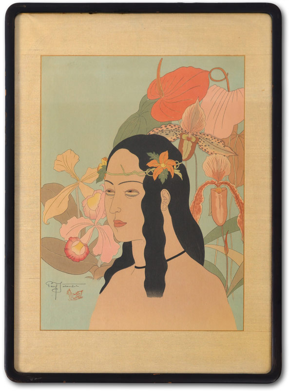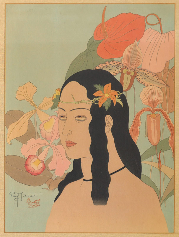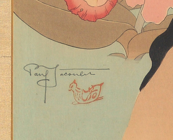 JACOULET, Paul, (French, 1896-1960): ''Un Belle de Palos'', Japanese Woodblock Print, 15 1/8'' x 11 1/2'', pencil signed lower left above mandarin duck seal, encased in custom lacquer frame with wear 21 1/8'' x 16''.
