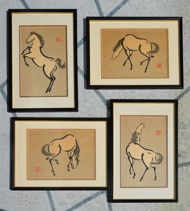 URUSHIBARA, Yoshijiro (Mokushu), (Japanese, 1888-1953): 4 Woodblock Prints of Horses, Sight sizes range from 13 1/2'' x 9 1/4'' to 9 1/4'' x 13 1/2'', stamp signature in the plate, matching black frames 20'' x 14'' and 14'' x 20''.
