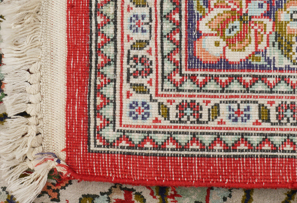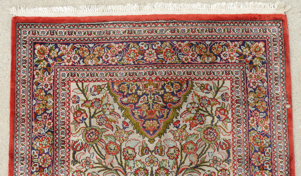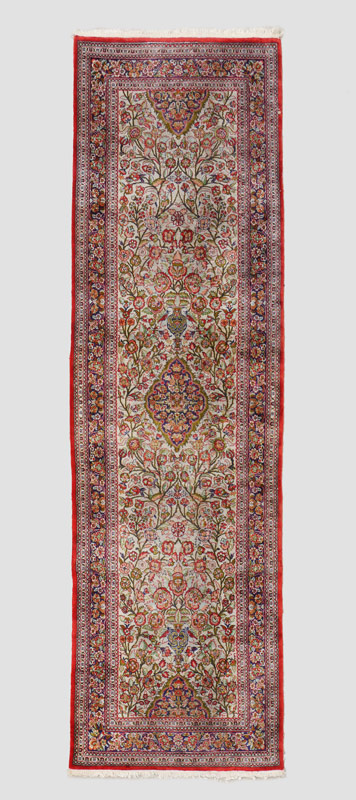 HAND MADE PERSIAN ORIENTAL RUNNER, 2'6'' x 8': This is a finely knotted rug, looks like a synthetic silk with very fine pattern of realistically drawn flowers, one center medallion and two half medallions with two vases that are on either end of two of the medallions. It is asymmetrical in direction and the flowers are different types of real flowers on a pastel or whitish green field. There is a deep blue border and multiple guard borders to finish out the rug.