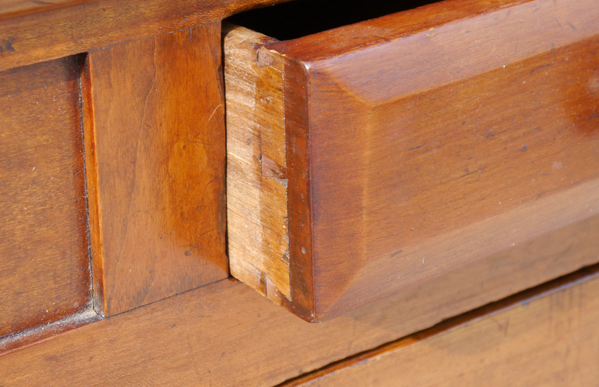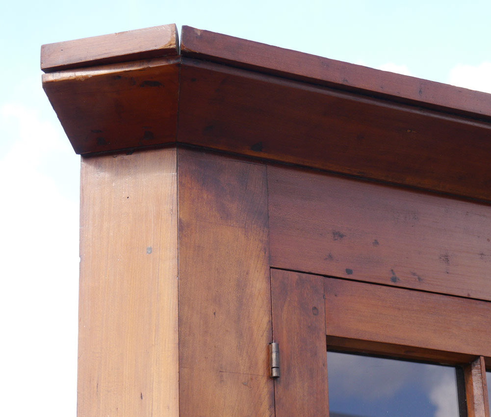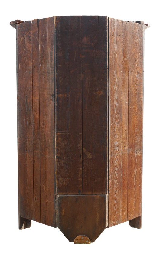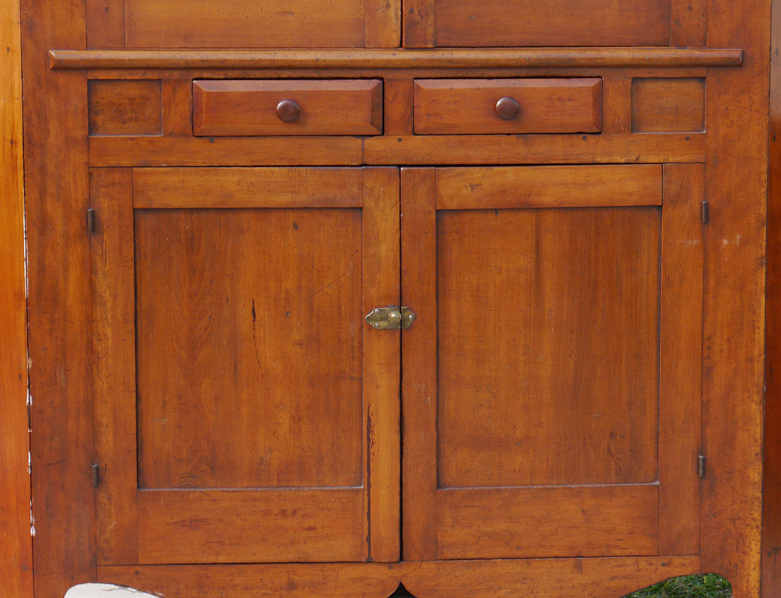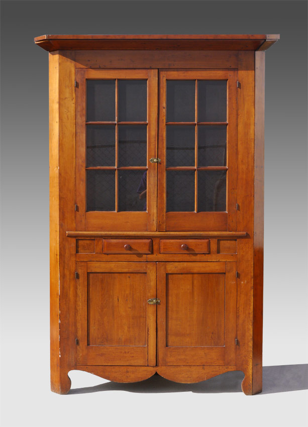 EARLY CORNER CABINET: Pegged and through tenon construction, 12 light top section with 2 interior shelves over 2 small drawers. Lower section with 2 doors, shaped skirt and feet. Overall 83 1/2'' h. x 57'' x 22 1/2''.