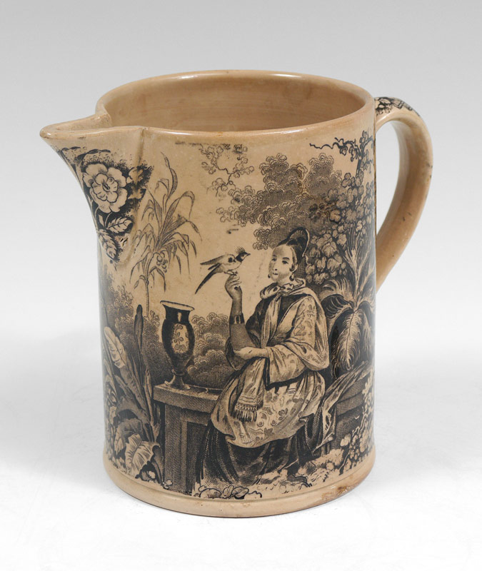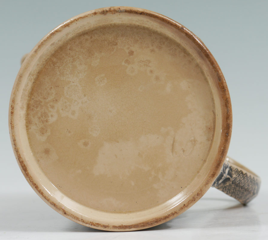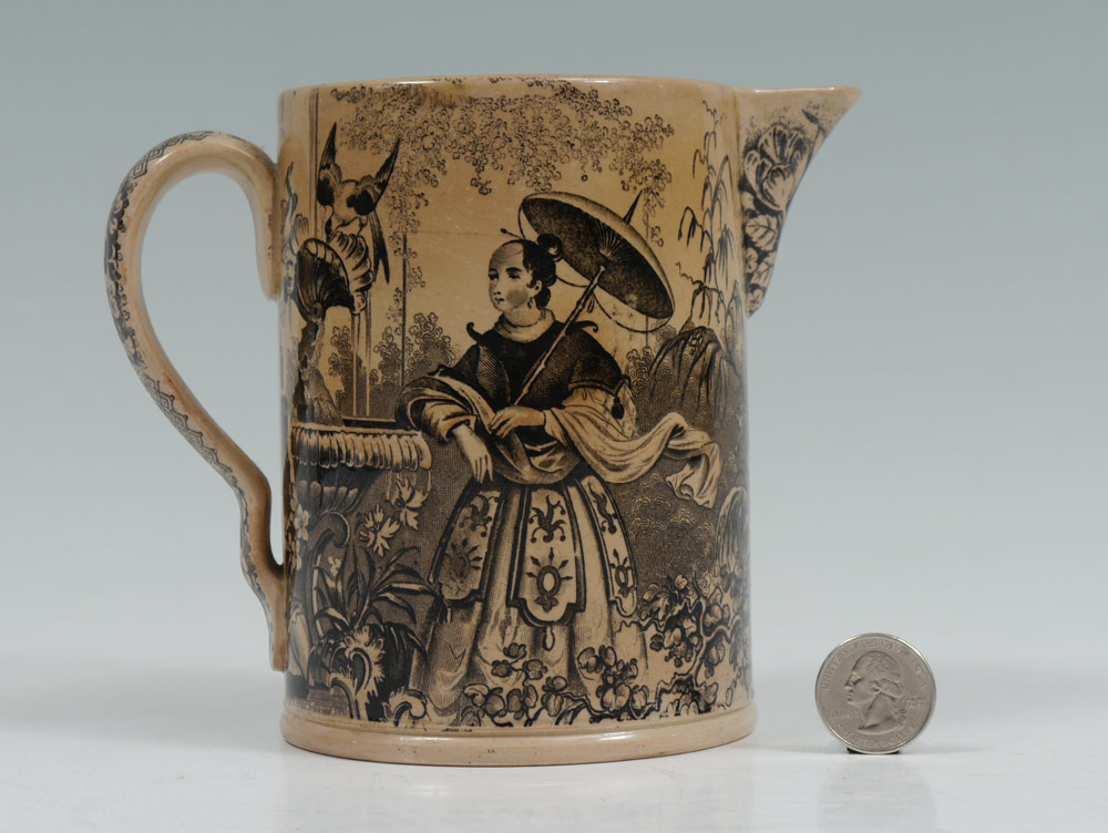 STAFFORDSHIRE CREAMWARE TRANSFER PITCHER: Oriental genre motifs, unmarked as to maker, incised 3 on base. Measures 5 3/8'' h. x 6 1/2''.