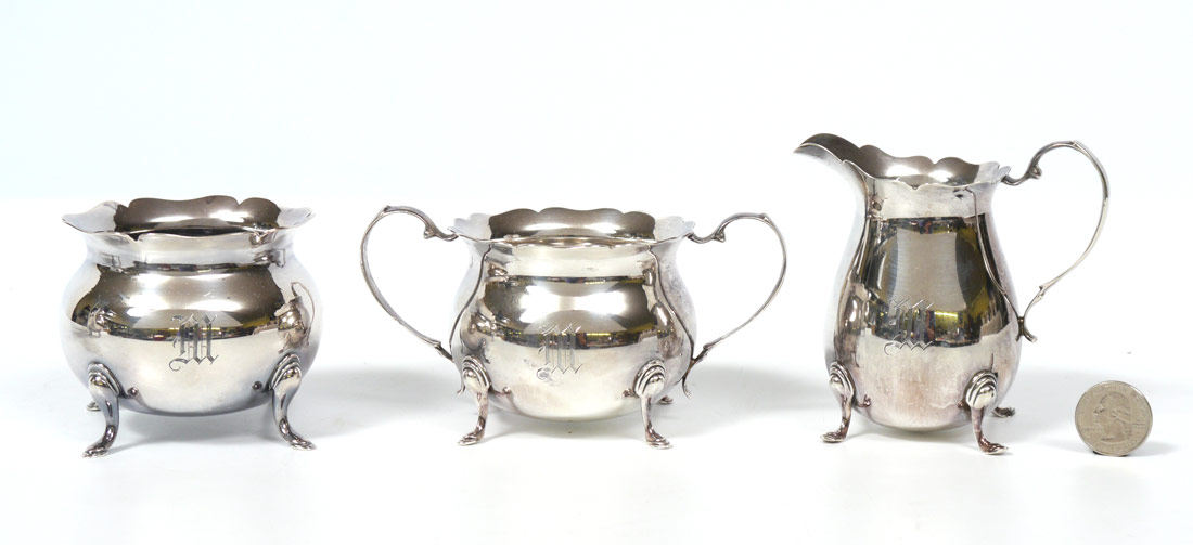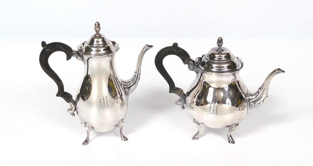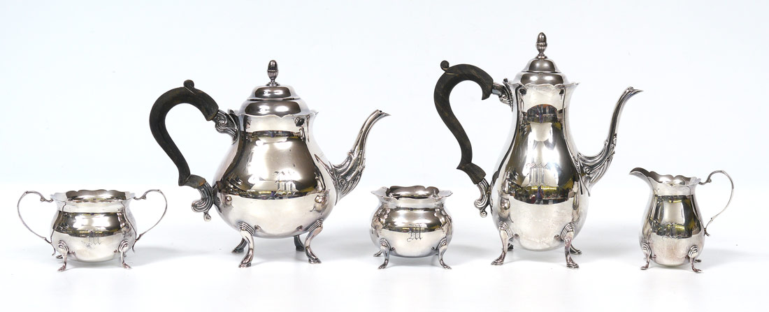 5 PIECE J. WAGNER & SON STERLING SILVER COFFEE SET: 5 pieces total by J. Wagner & Son to include 1) Coffee pot, hinged lid with acorn finial, wood handle, 9'' h. 2) Teapot, hinged lid with acorn finial, wood handle, 8'' h. 3) Open sugar, 2 7/8'' h. 4) Open creamer, 3 3/4'' h. 5) Open waste bowl, 2 3/4'' h.. Monogrammed ''M''. Approx. 53 troy oz. inclusive of handles.