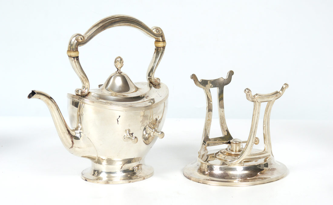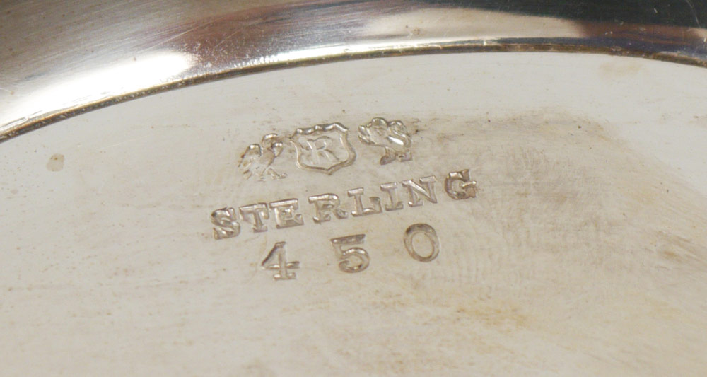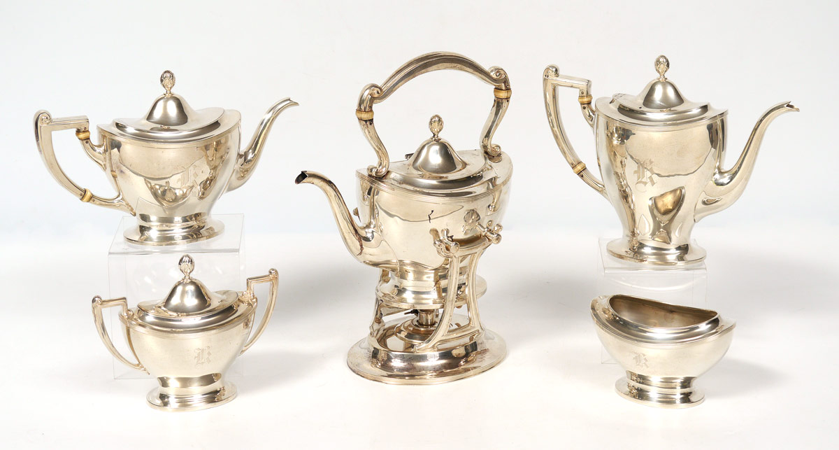 5 PIECE REED & BARTON STERLING TEA & COFFEE SERVICE: 5 pieces by Reed & Barton, each marked 450, to include 1) Hot water on stand with burner, hinged lid, Overall 12 1/2'' h. x 9 3/4''. 2) Coffee pot, hinged lid, 8 1/4'' h. x 10 1/2''. 3) Teapot, hinged lid, 6 1/2'' h. x 11''. 4) Covered sugar, 5 3/4'' x 7 1/2''. 5) Open waste bowl, 3 1/2'' h. x 5 3/4''. Monogrammed. Approx. 108.7 troy oz.