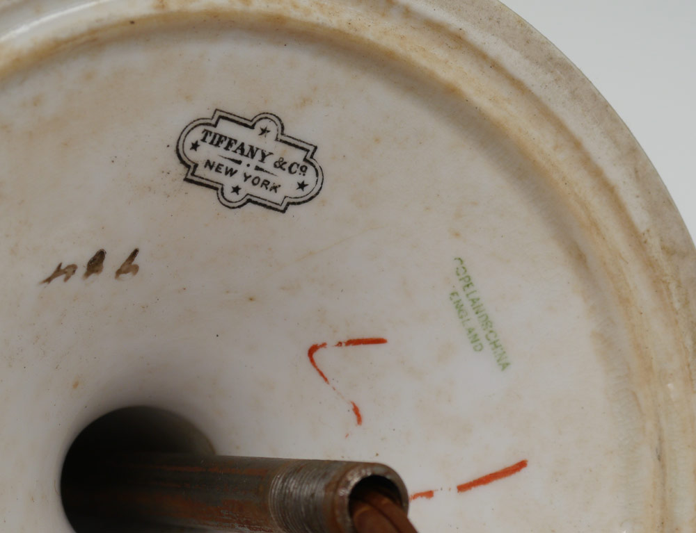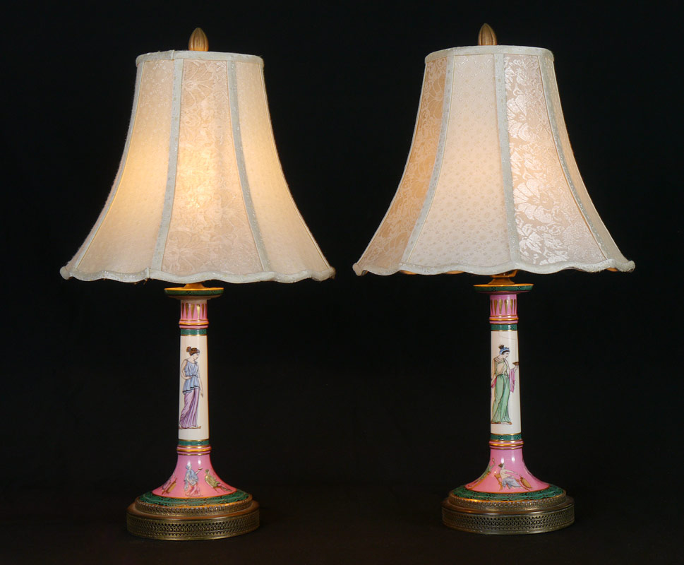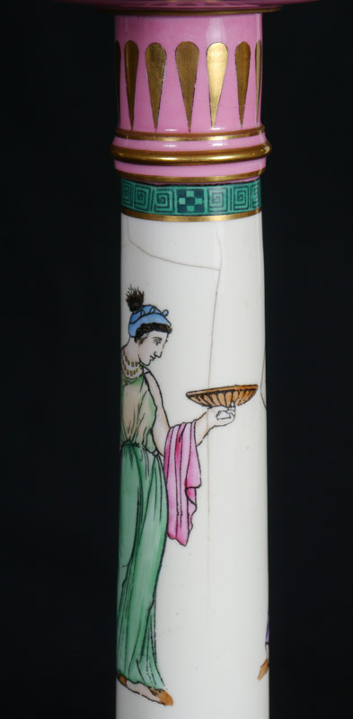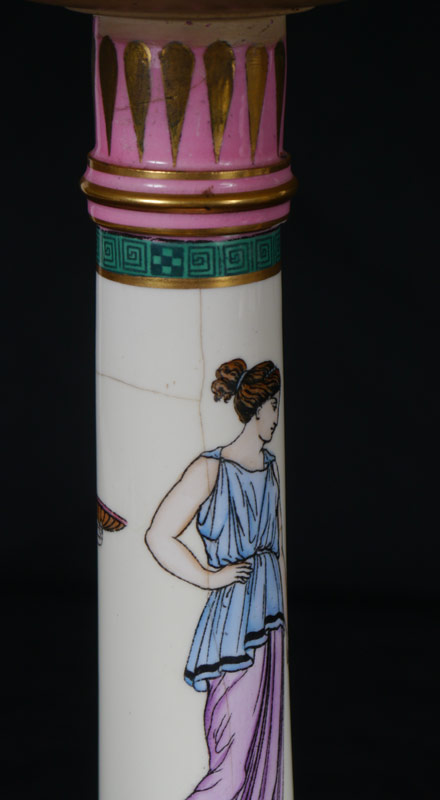 PR COPELANDS CHINA PORCELAIN CANDLESTICK LAMPS: Converted Copelands China Candlesticks decorated with multiple renderings of Grecian Women in various poses. Base marked Tiffany & Co, Copelandschina, England. Candlestick measures 10 1/2''h, 21''h overall.