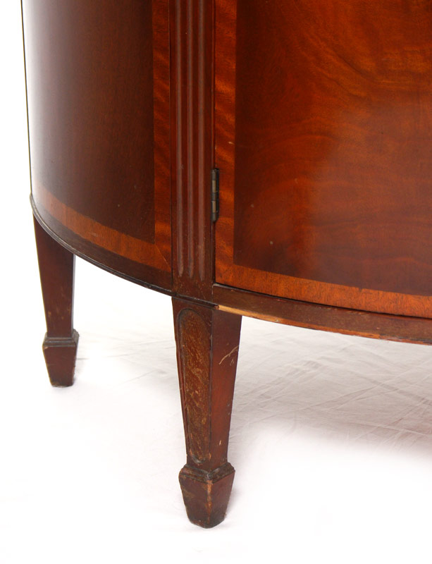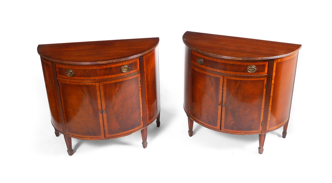 PAIR BANDED MAHOGANY DEMI CHEST COMMODES: Each with glass top, single drawer over double doors with single interior shelf. 33 1/2'' h. x 38'' x 19''