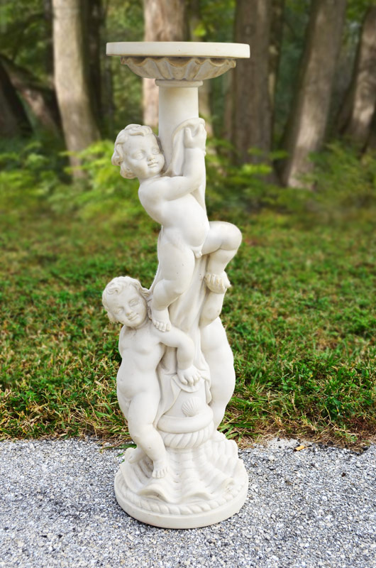 CARVED STONE FIGURAL PEDESTAL: With 3 figural putti, 2 supporting a third on clamshell design base. Marked 1092K and eagle with spread wing mark on base. Illegibly signed under base. Measures 35 1/2'' h. x 10 1/2''.