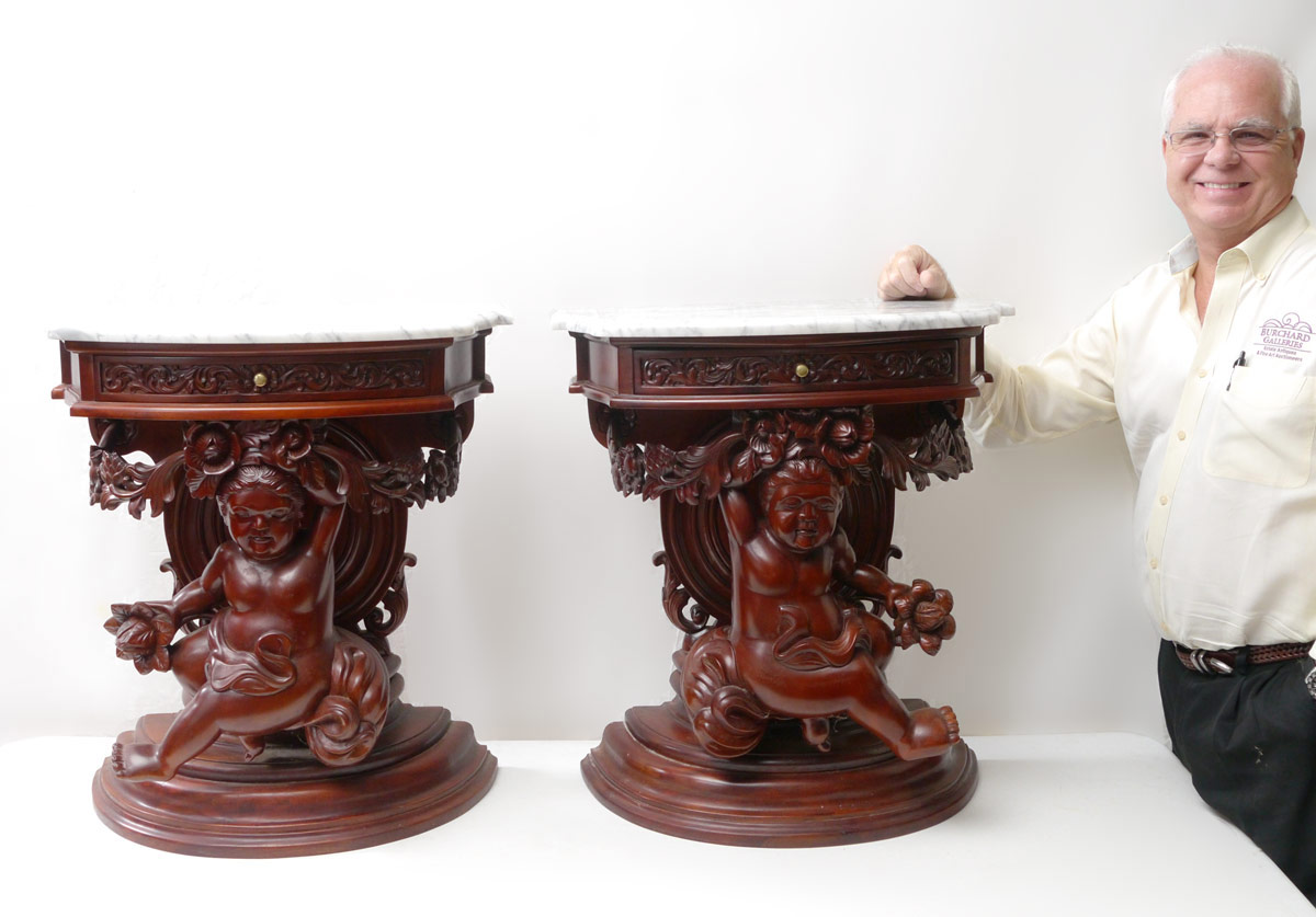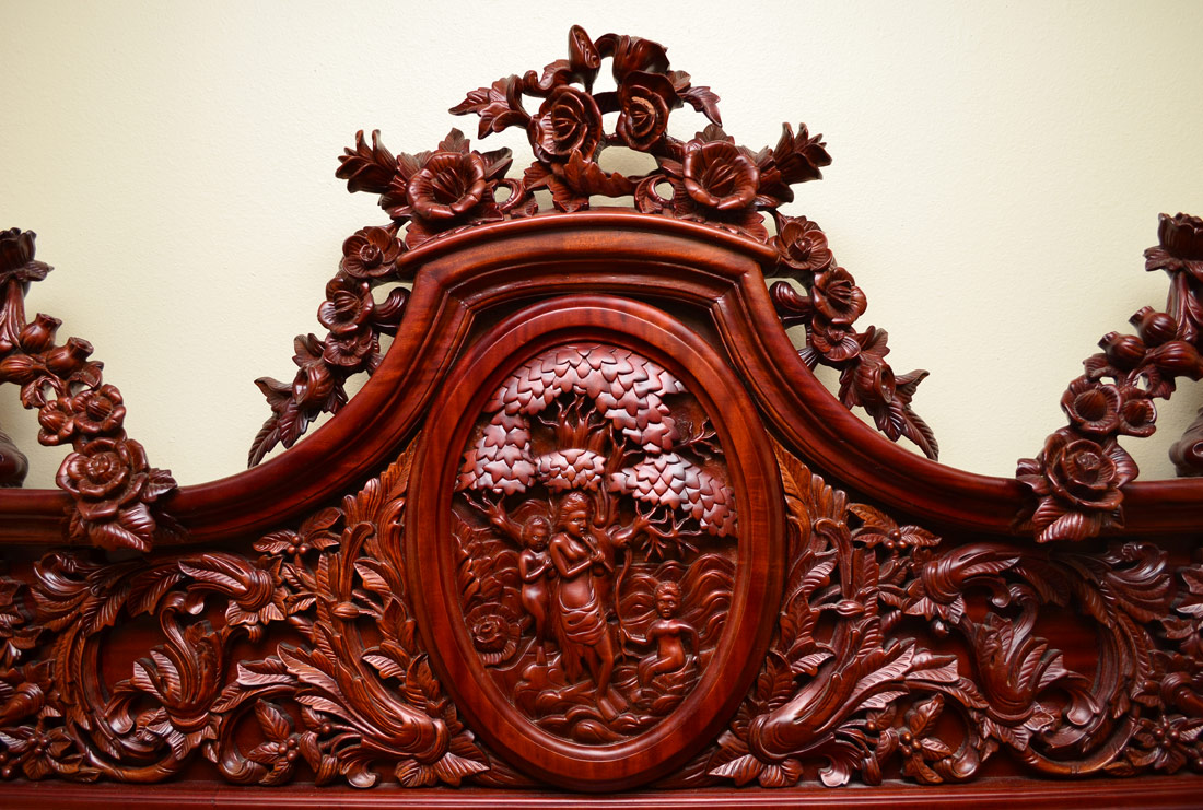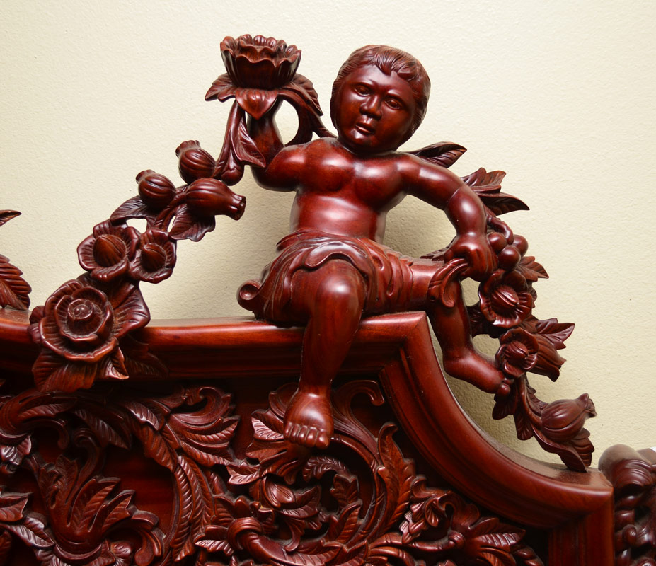 ITALIAN RENAISSANCE CARVED MAHOGANY BEDROOM SET: Over the top, carved to death KING BED (headboard 72'' h. x 85'' x 5 1/2'', footboard 31 1/2'' h.), marble top 6 drawer DRESSER (37 3/4'' h. x 59'' x 23'') with MIRROR (64 1/4'' h. x 44'' x 4''), and Pair of marble top NIGHTSTANDS (28'' h. x 25'' x 13 1/4'') with life size Cherub supports. Central familial scene surrounded by Putti, floral swags, berries and acanthus leaves.