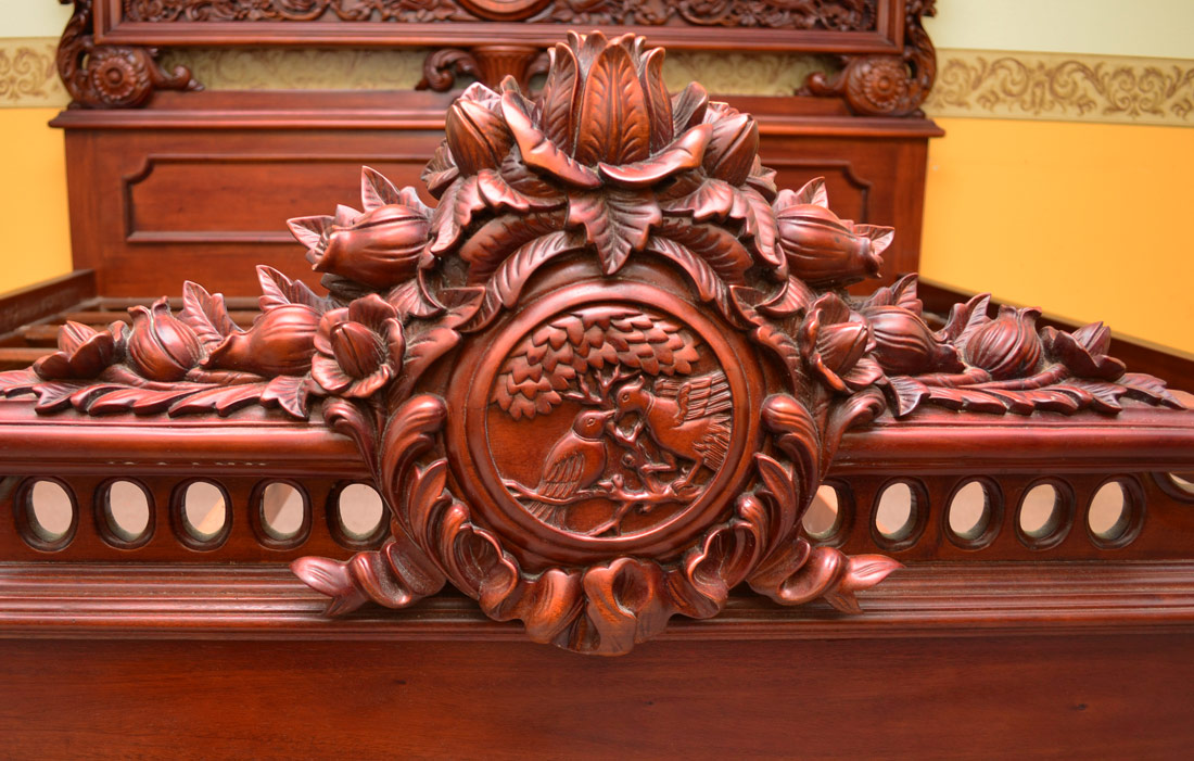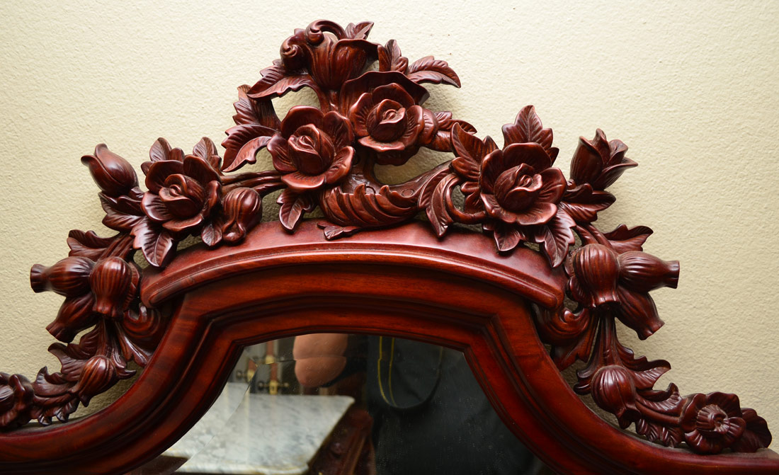 CONDITION: Bed missing the occasional petal, dresser with scratches and rubs, repairs to marble on dresser.