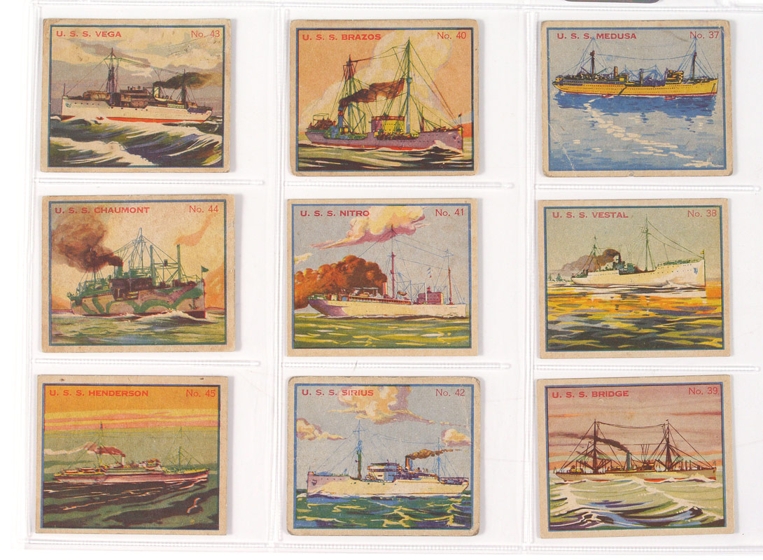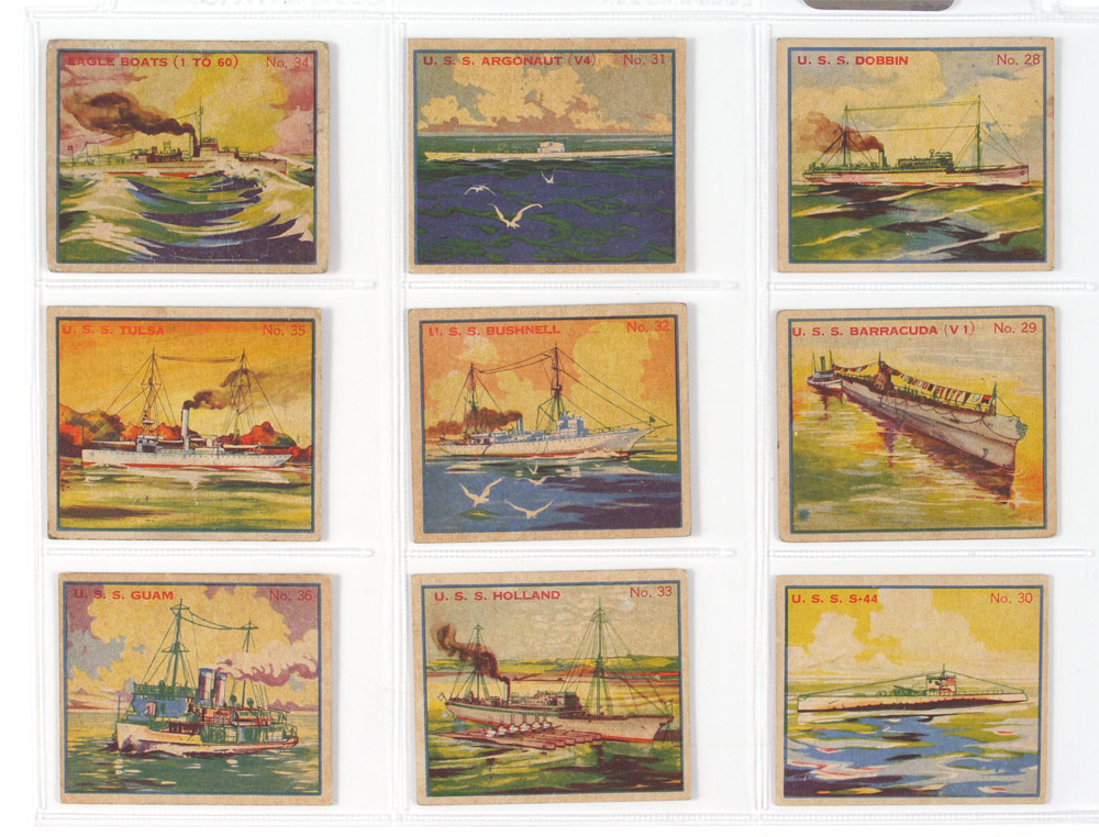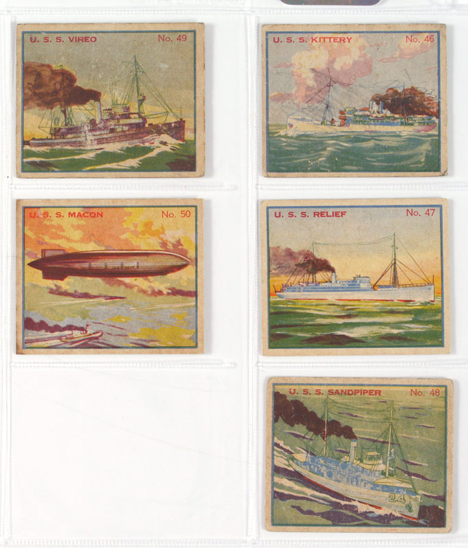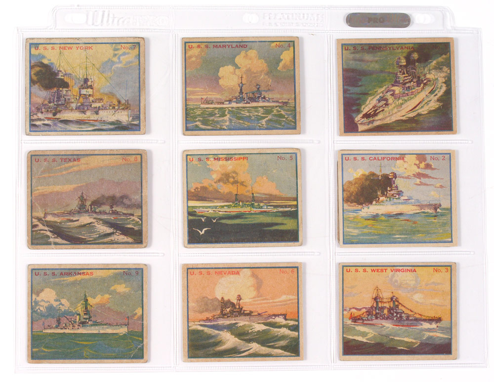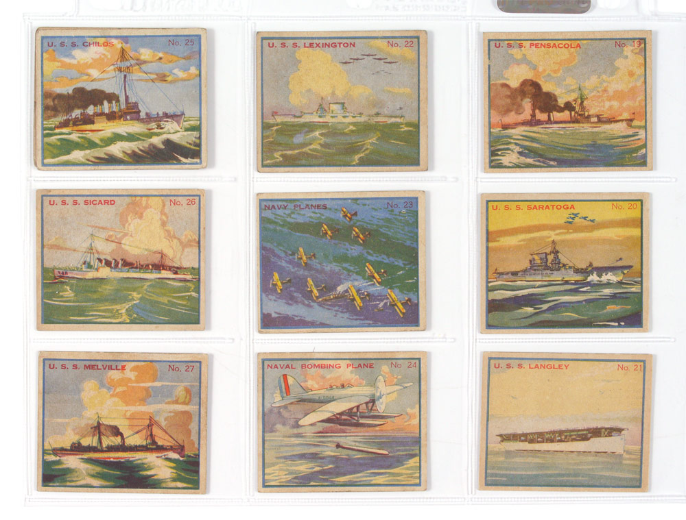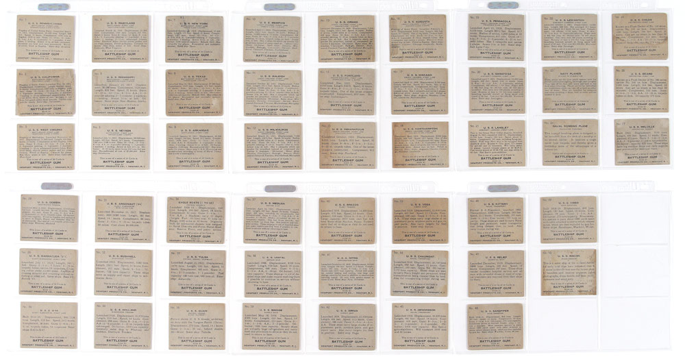 51 R20 BATTLESHIP GUM TRADING CARDS: 51 cards, R20, 1930's, Newport Products Co., sequential set #1-50, 2 1/2'' x 2 7/8''.