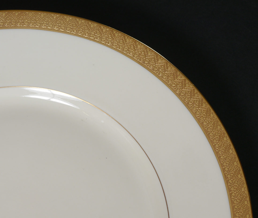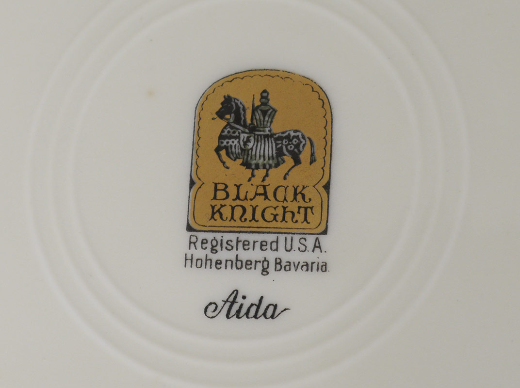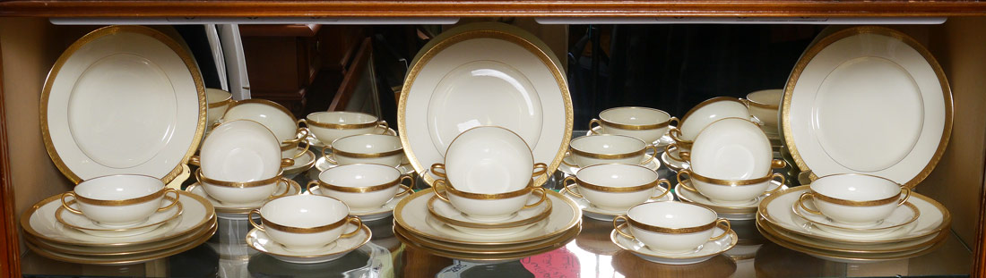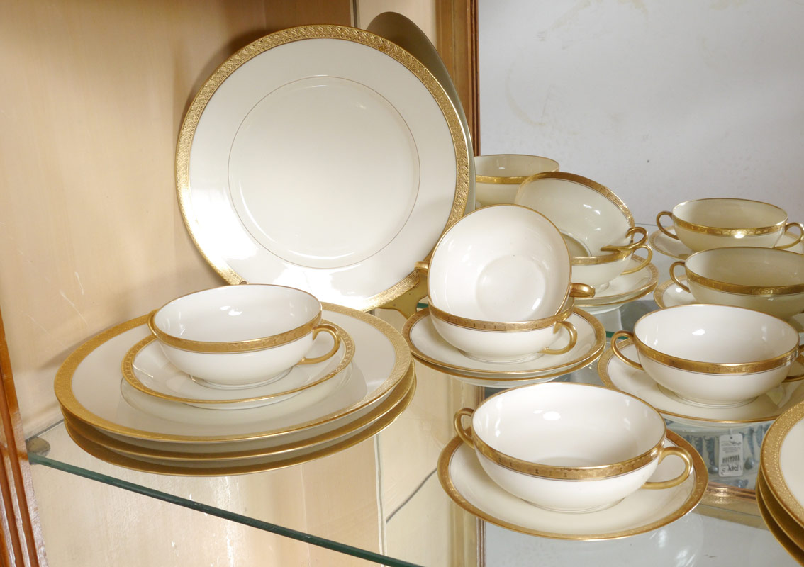 BLACK KNIGHT ''AIDA'' FINE CHINA: 12 dinner plates (10'') and 12 cream soup bowls with saucers (6'' dia.). Embossed gold border.
