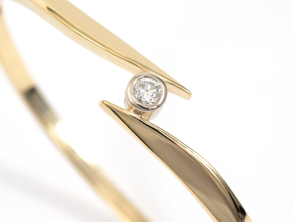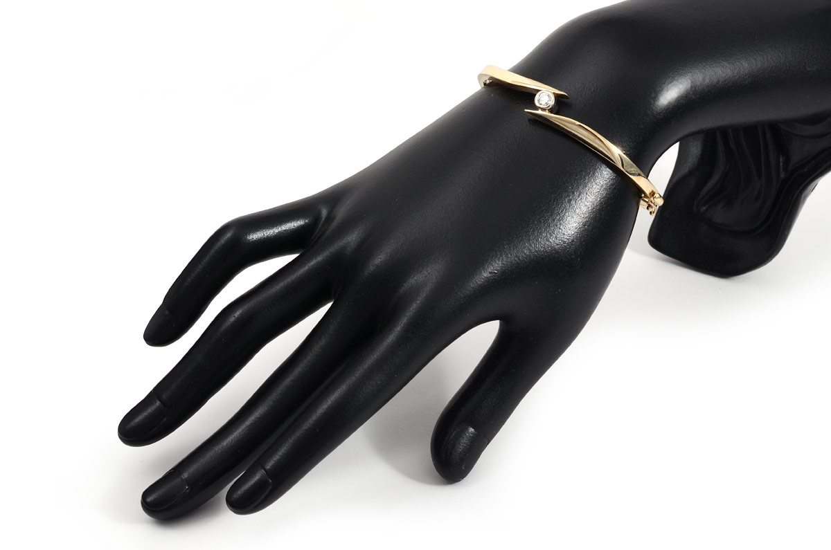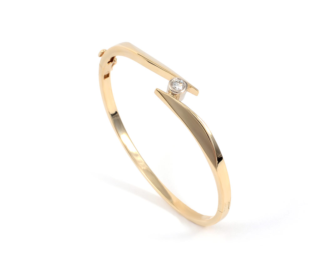 14K DIAMOND BANGLE BRACELET: 14K yellow gold bracelet with one round brilliant cut diamond. Weight: .25 Ct. Approx. Rated SI1 in clarity and H-I in color. The diamond is bezel set. Hinged bangle with figure eight safety claps. Weight: 15.1 grams.