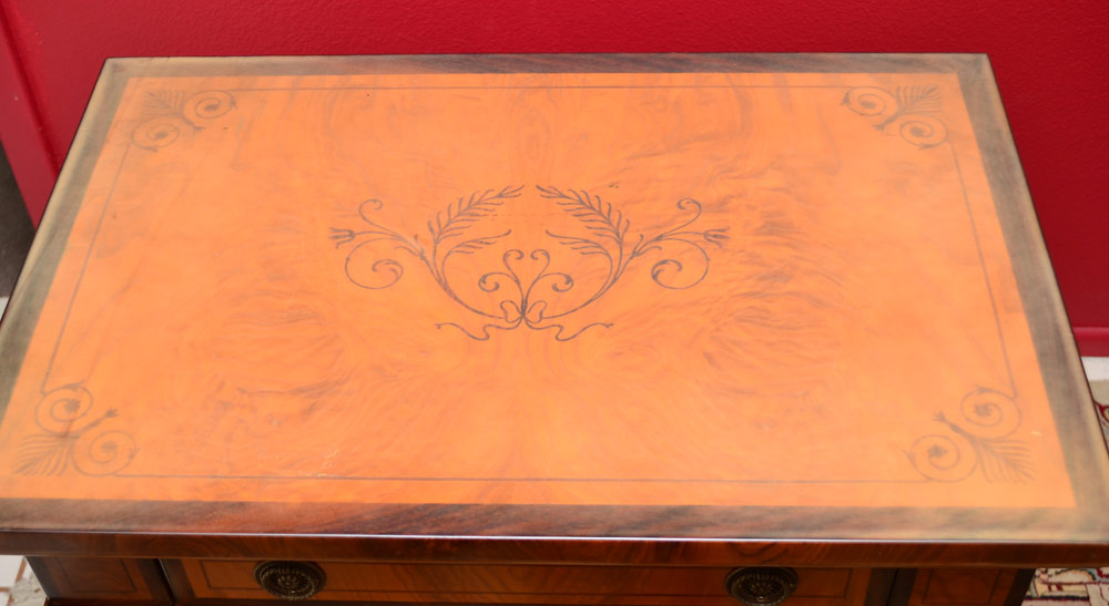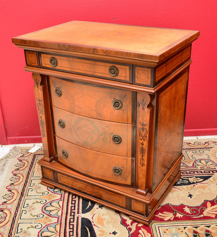 ITALIAN INLAY COMMODE: Marquetry and parquetry inlay four drawer chest. ''Made in Italy'' metal plate. 29'' h. x 25'' x 16 5/8''.