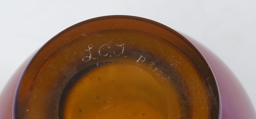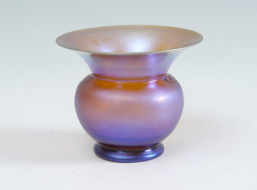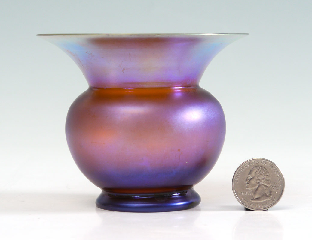 DIMINUTIVE LCT TIFFANY FAVRILE VASE: Flared rim, marked LCT B3128. Measures 3 1/4'' h. x 4''.
