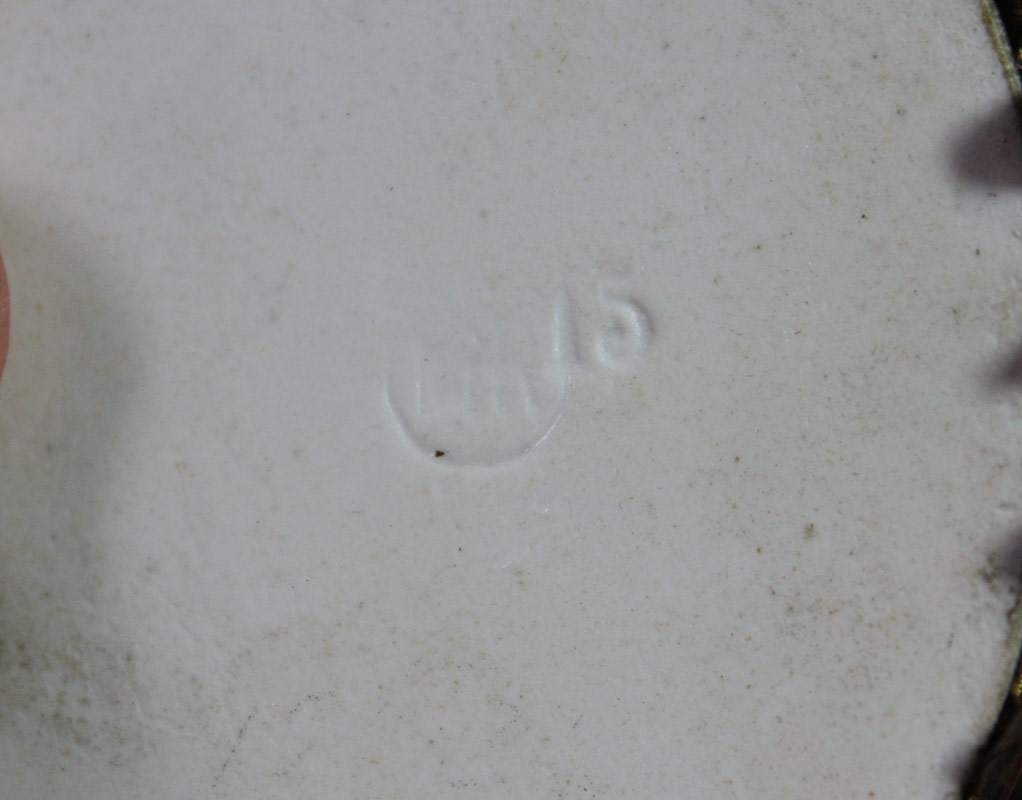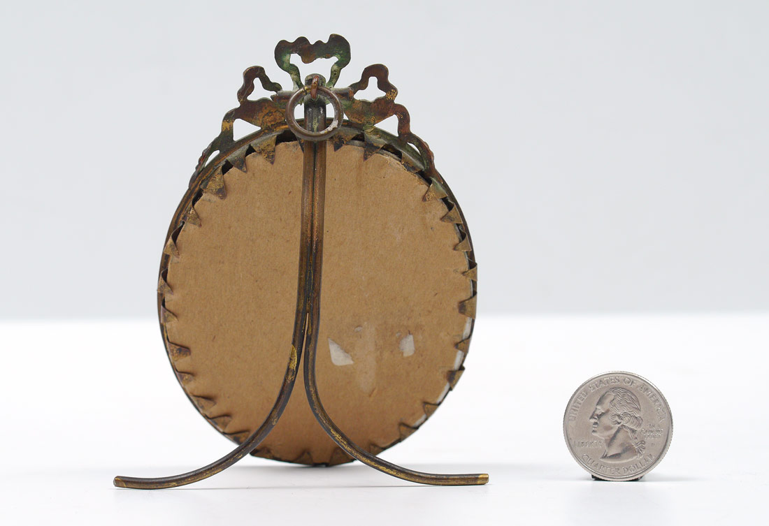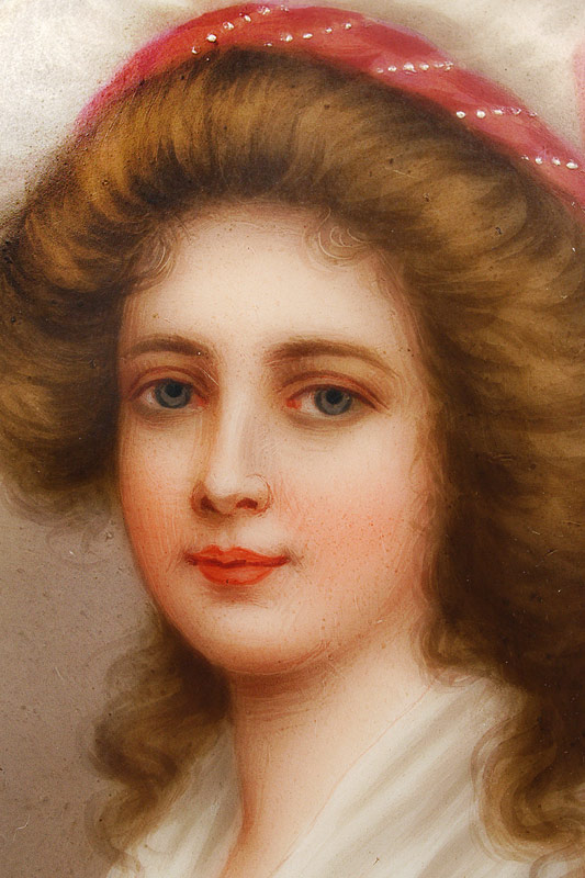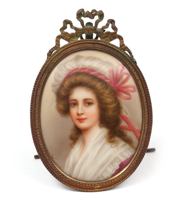 HUTSCHENREUTHER PAINTED PORCELAIN PLAQUE SIGNED WAGNER: Depicting a Young Beauty with Red Bow, 3 1/4'' x 2 1/2'', impressed Hutschenreuther mark verso, signed lower left, encased in original gilt metal frame with ribbon cartouche 4 1/4 '' x 2 7/8''.