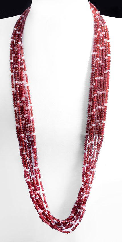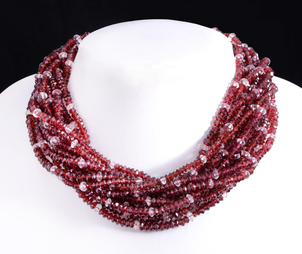1000 Ct. GARNET & QUARTZ BEAD NECKLACE: 7 separated strands of Faceted garnet and clear quartz beads. Weight: 1000 Ct. Length 32''.