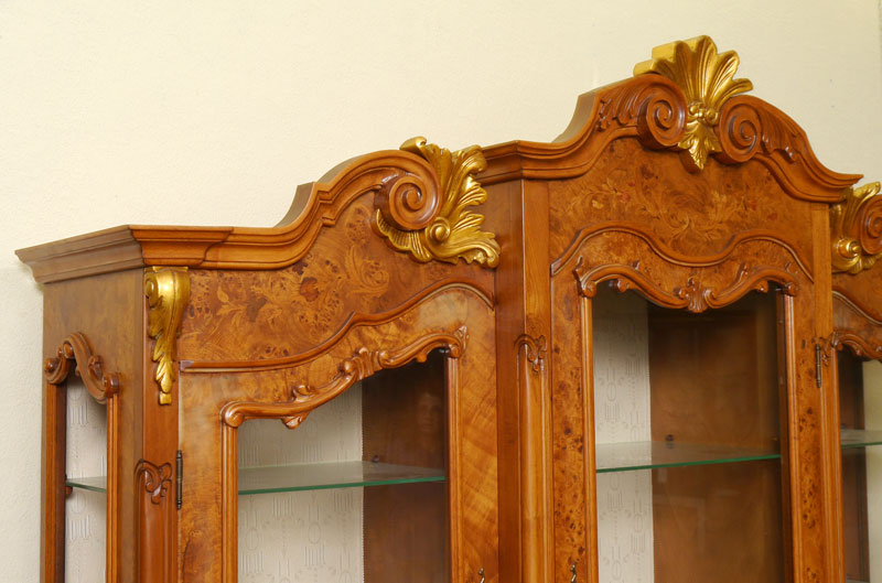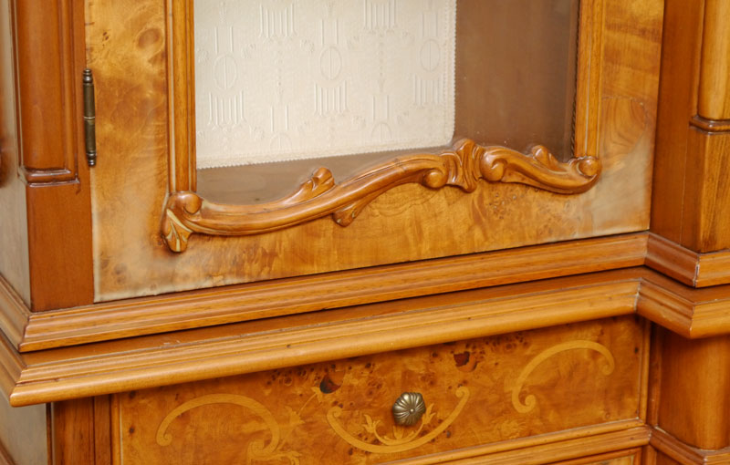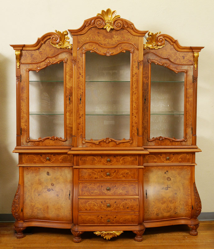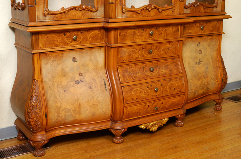 AN ORNATE ITALIAN CARVED MARQUETRY INLAY BOMBAY CHINA CABINET: Carved and gilt wood crest, floral marquetry inlaid design all over. Top with 3 glass front doors, 2 interior glass shelves. Base with 5 central drawers, surmounted by single drawer over single door. On carved feet. Overall 91 3/4'' h. x 79'' x 24''.