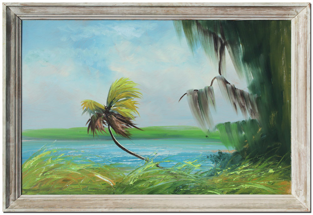 HAIR, Alfred, (American, 1941-1971): Florida River Scene with Palm and Willow, Oil/Upsonboard, 24'' x 36'', unsigned, encased in original frame 27'' x 39'', documentation from expert James Fitch, to conclude that this is indeed an unsigned Hair.