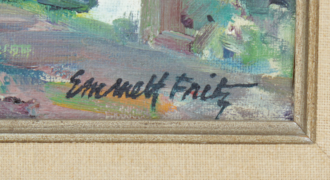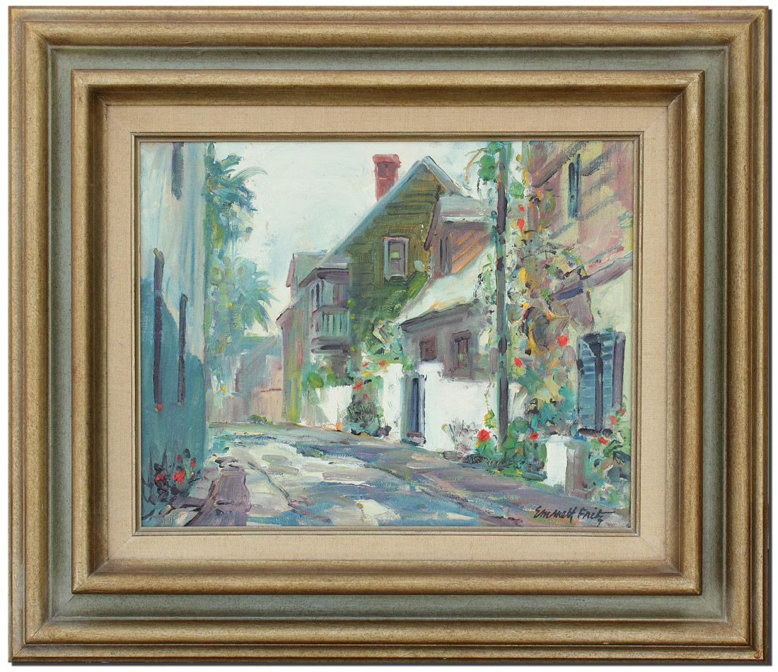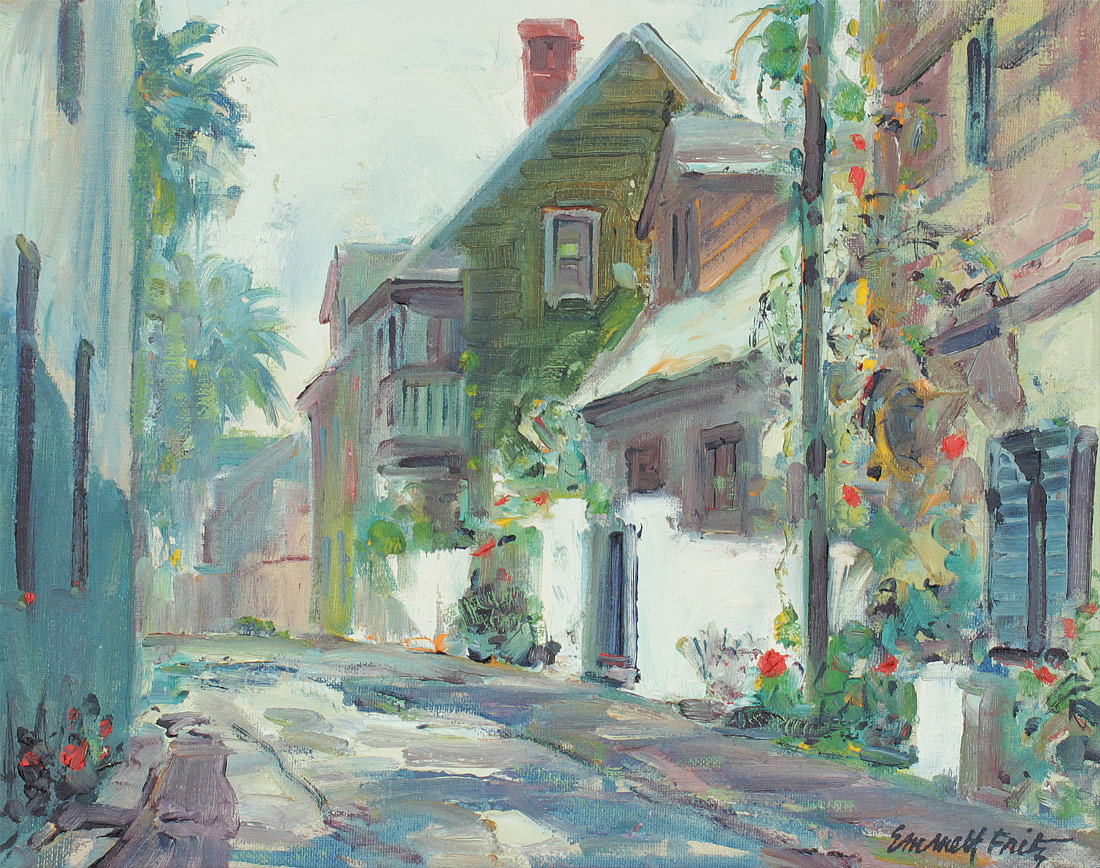FRITZ, Emmett (John Emmett), (American, 1917-1995): ''Marine Street Looking North'', St. Augustine, Florida, Oil/Canvasboard, 10 3/4'' x 13 7/8'', signed lower right, titled verso, original frame 13'' x 21 1/4''.