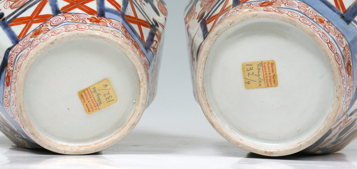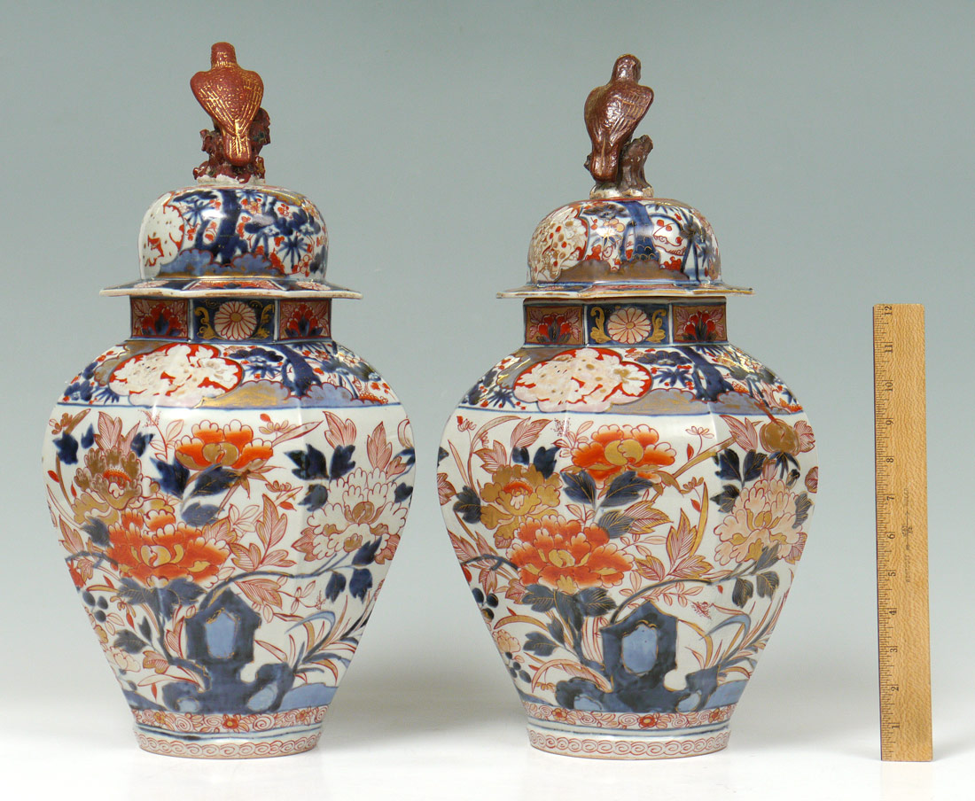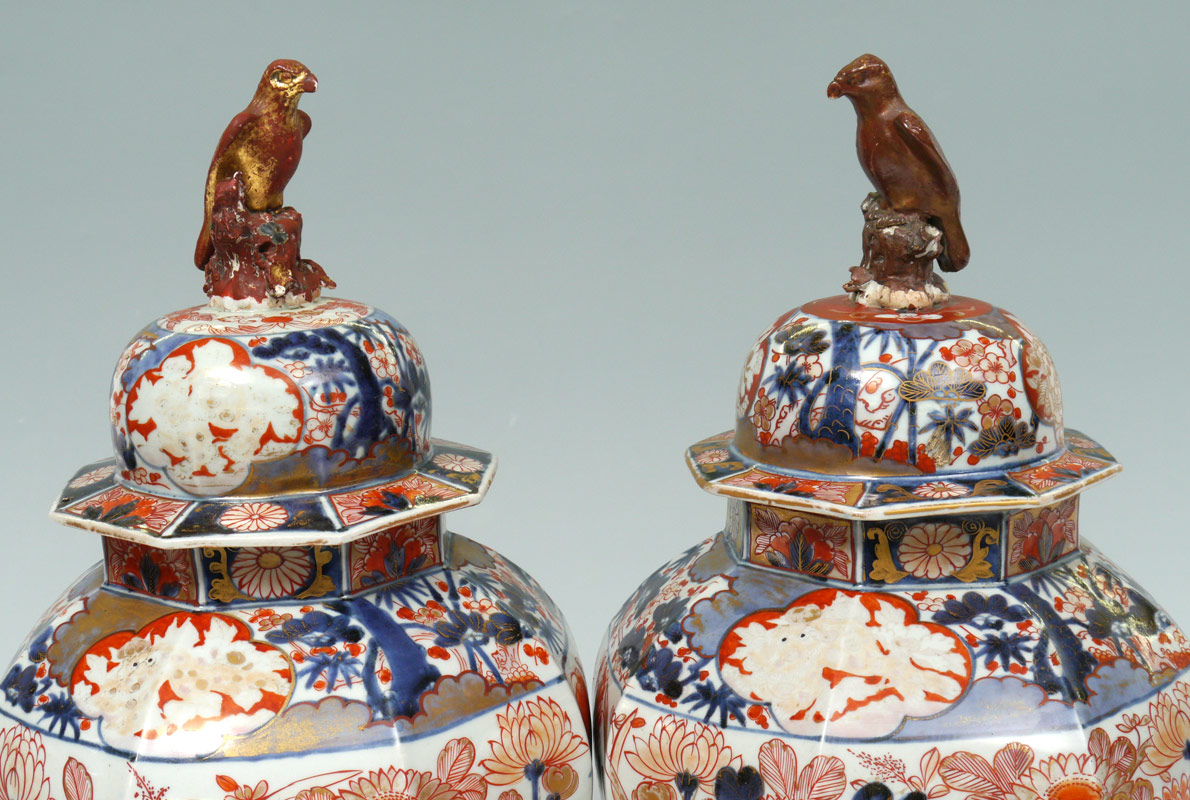 PAIR JAPANESE IMARI COVERED VASES: Pair of 19'' baluster covered vases, the lid surmounted by figural falcons. Decorated in floral panels in iron red, cobalt and gold.