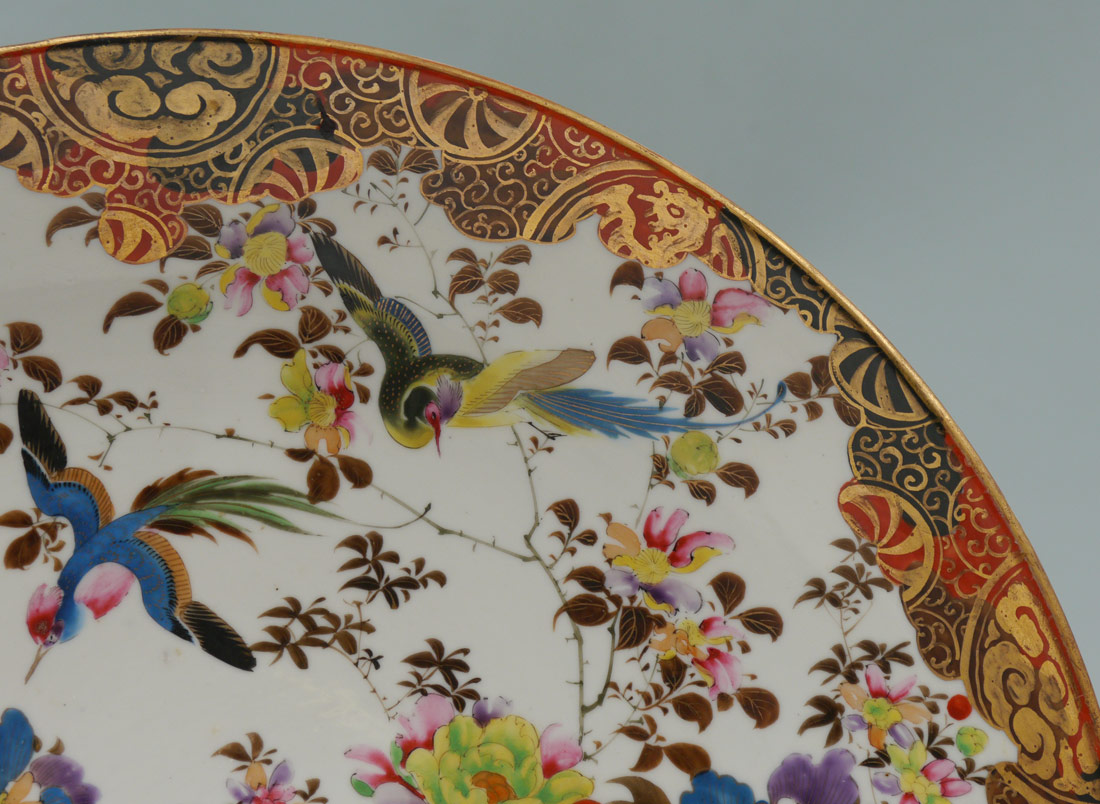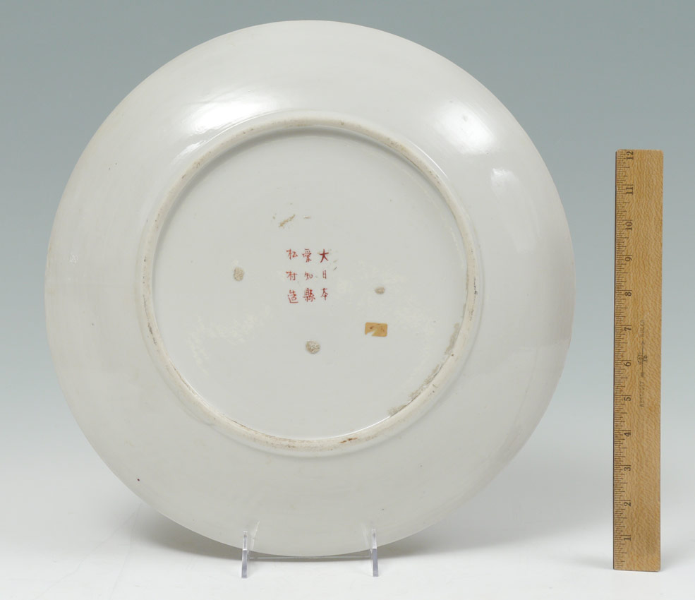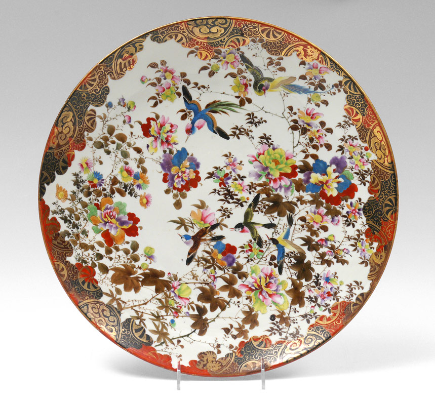 JAPANESE CHARGER: Hand painted in abundance depicting birds, and fauna, Signed in characters verso. 15 1/2'' diameter