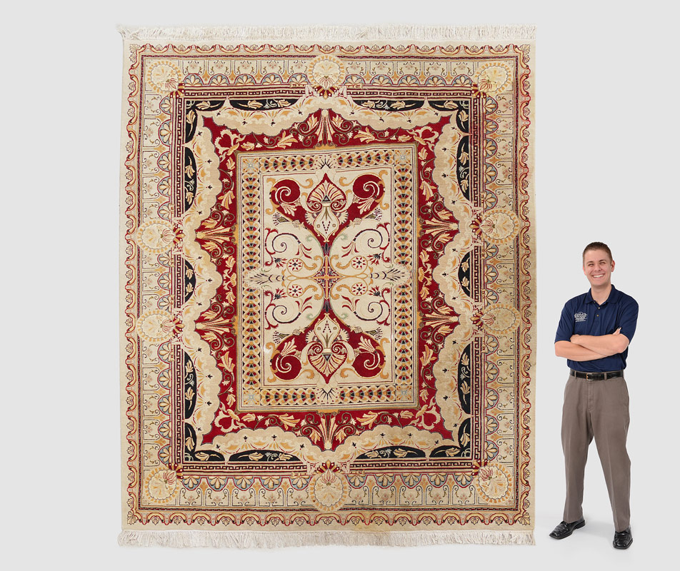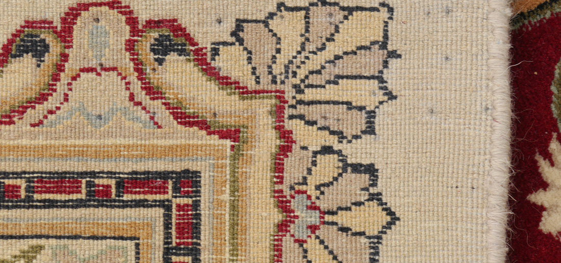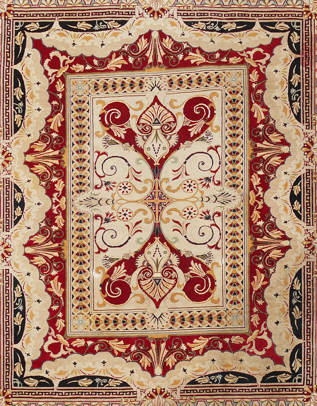 PAKISTANI HAND KNOTTED WOOL CARPET, 8' x 9'8'': Ivory ground, border with repeating pattern, florettes and scalloped medallions between swags. Center with mirror image design and repeating pattern border.