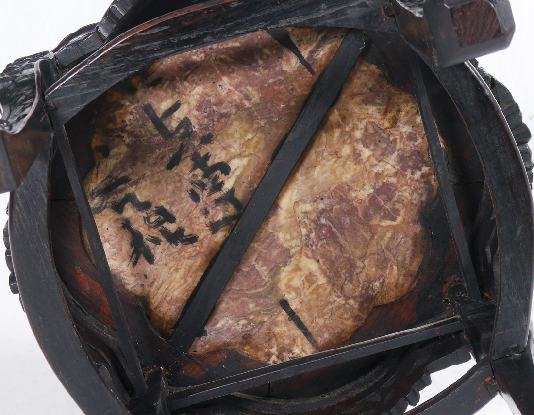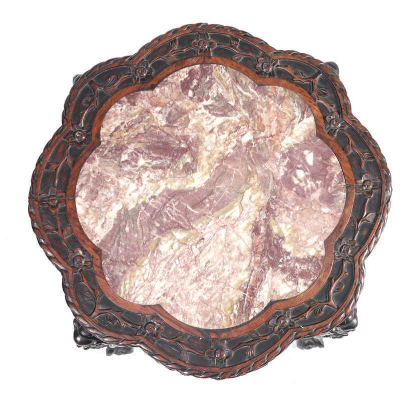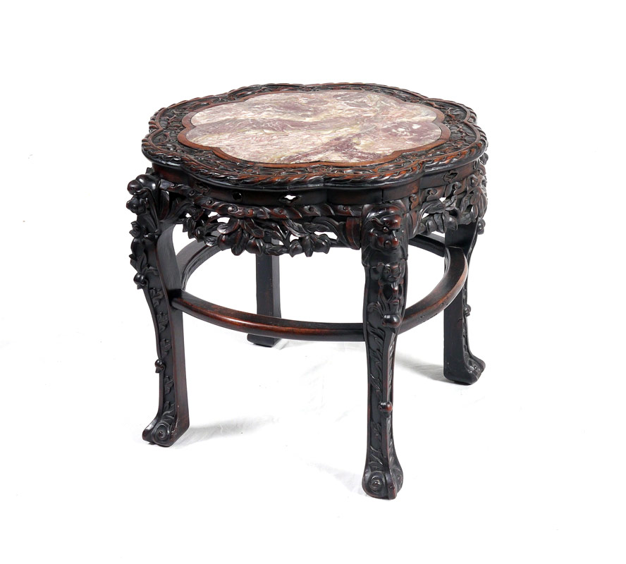 MARBLE TOP CARVED CHINESE STAND: Shaped inset marble top, carved base. Measures 20 3/4'' h. x 24 1/2''